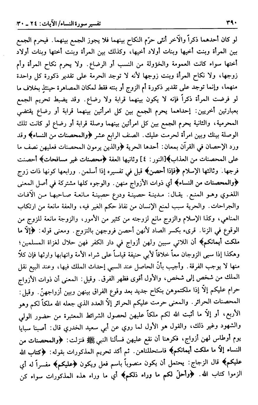 لو كان أحدهما ذكرا والآخر أنثى حرّم النكاح بينهما فلا يجوز الجمع بينهما. فيحرم الجمع بين المرأة وبنت أخيها وبنات أولاد أخيها، وكذلك بين المرأة وبنت أختها وبنات أولاد أختها سواء كانت العمومة والخئولة من النسب أو الرضاع. ولا يحرم نكاح المرأة وأم زوجها، ولا نكاح المرأة وبنت زوجها لأنه لا توجد الحرمة على تقدير ذكورة كل واحدة منهما، وإنما توجد على تقدير ذكورة أم الزوج أو بنته فقط لمكان المصاهرة حينئذ بخلاف ما لو فرضت المرأة ذكرا فإنه لا يكون بينهما قرابة ولا رضاع. وقد يضبط تحريم الجمع بعبارتين أخريين: إحداهما يحرم الجمع بين كل امرأتين بينهما قرابة أو رضاع يقتضي المحرمية، والثانية يحرم الجمع بين كل امرأتين بينهما وصلة قرابة أو رضاع لو كانت تلك الوصلة بينك وبين امرأة لحرمت عليك. الصنف الرابع عشر وَالْمُحْصَناتُ مِنَ النِّساءِ وقد ورد الإحصان في القرآن بمعان: أحدها الحرية وَالَّذِينَ يَرْمُونَ الْمُحْصَناتِ فَعَلَيْهِنَّ نِصْفُ ما عَلَى الْمُحْصَناتِ مِنَ الْعَذابِ [النور: 4] وثانيها العفة مُحْصَناتٍ غَيْرَ مُسافِحاتٍ أحصنت فرجها. وثالثها الإسلام فَإِذا أُحْصِنَّ قيل في تفسيره إذا أسلمن. ورابعها كونها ذات زوج وَالْمُحْصَناتُ مِنَ النِّساءِ أي ذوات الأزواج منهن. والوجوه كلها مشتركة في أصل المعنى اللغوي وهو المنع. يقال: مدينة حصينة ودرع حصينة مانعة صاحبها من الآفات والجراحات. والحرية سبب لمنع الإنسان من نفاذ حكم الغير فيه، والعفة مانعة من ارتكاب المناهي، وكذا الإسلام والزوج مانع لزوجته من كثير من الأمور، والزوجة مانعة للزوج من الوقوع في الزنا. قرىء بكسر الصاد لأنهن أحصن فروجهن بالتزوج. ومعنى قوله: إِلَّا ما مَلَكَتْ أَيْمانُكُمْ أن اللاتي سبين ولهن أزواج في دار الكفر فهن حلال لغزاة المسلمين وهكذا إذا سبى الزوجان معا خلافا لأبي حنيفة قياسا على شراء الأمة واتهابها وارثها فإن كلا منها لا يوجب الفرقة. وأجيب بأنّ الحاصل عند السبي إحداث الملك فيها، وعند البيع نقل الملك من شخص إلى شخص، والأول أقوى فظهر الفرق. وقيل: المعنى أن ذوات الأزواج حرام عليكم إلّا إذا ملكتموهن بنكاح جديد بعد وقوع الفراق بينهن وبين أزواجهنّ. وقيل: