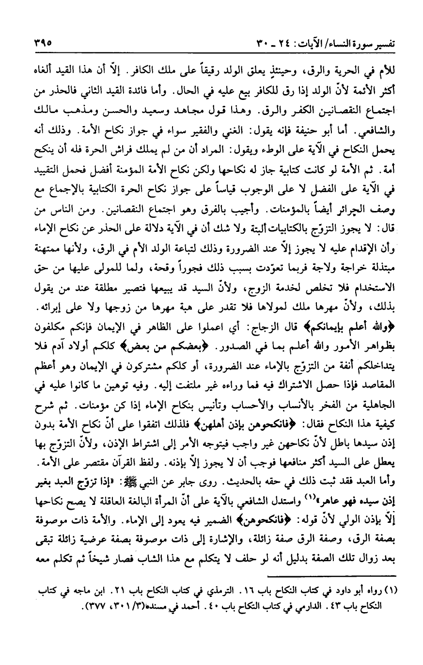 للأم في الحرية والرق، وحينئذ يعلق الولد رقيقا على ملك الكافر. إلّا أن هذا القيد ألغاه أكثر الأئمة لأنّ الولد إذا رق للكافر بيع عليه في الحال. وأما فائدة القيد الثاني فالحذر من اجتماع النقصانين الكفر والرق. وهذا قول مجاهد وسعيد والحسن ومذهب مالك والشافعي. أما أبو حنيفة فإنه يقول: الغني والفقير سواء في جواز نكاح الأمة. وذلك أنه يحمل النكاح في الآية على الوطء ويقول: المراد أن من لم يملك فراش الحرة فله أن ينكح أمة. ثم الأمة لو كانت كتابية جاز له نكاحها ولكن نكاح الأمة المؤمنة أفضل فحمل التقييد في الآية على الفضل لا على الوجوب قياسا على جواز نكاح الحرة الكتابية بالإجماع مع وصف الجرائر أيضا بالمؤمنات. وأجيب بالفرق وهو اجتماع النقصانين. ومن الناس من قال: لا يجوز التزوّج بالكتابيات البتة ولا شك أن في الآية دلالة على الحذر عن نكاح الإماء وأن الإقدام عليه لا يجوز إلّا عند الضرورة وذلك لتباعة الولد الأم في الرق، ولأنها ممتهنة مبتذلة خراجة ولاجة فربما تعوّدت بسبب ذلك فجورا وقحة، ولما للمولى عليها من حق الاستخدام فلا تخلص لخدمة الزوج، ولأنّ السيد قد يبيعها فتصير مطلقة عند من يقول بذلك، ولأنّ مهرها ملك لمولاها فلا تقدر على هبة مهرها من زوجها ولا على إبرائه.