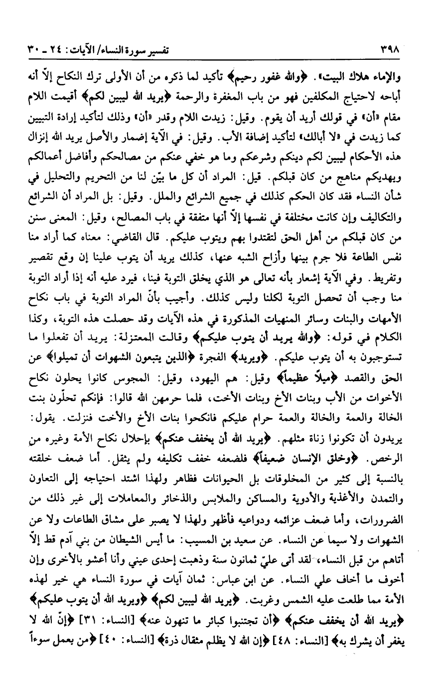 يريدون أن تكونوا زناة مثلهم. يُرِيدُ اللَّهُ أَنْ يُخَفِّفَ عَنْكُمْ بإحلال نكاح الأمة وغيره من الرخص. وَخُلِقَ الْإِنْسانُ ضَعِيفاً فلضعفه خفف تكليفه ولم يثقل. أما ضعف خلقته بالنسبة إلى كثير من المخلوقات بل الحيوانات فظاهر ولهذا اشتد احتياجه إلى التعاون والتمدن والأغذية والأدوية والمساكن والملابس والذخائر والمعاملات إلى غير ذلك من الضرورات، وأما ضعف عزائمه ودواعيه فأظهر ولهذا لا يصبر على مشاق الطاعات ولا عن الشهوات ولا سيما عن النساء. عن سعيد بن المسيب: ما أيس الشيطان من بني آدم قط إلّا أتاهم من قبل النساء، لقد أتى عليّ ثمانون سنة وذهبت إحدى عيني وأنا أعشو بالأخرى وإن أخوف ما أخاف علي النساء. عن ابن عباس: ثمان آيات في سورة النساء هي خير لهذه الأمة مما طلعت عليه الشمس وغربت. يُرِيدُ اللَّهُ لِيُبَيِّنَ لَكُمْ وَاللَّهُ يُرِيدُ أَنْ يَتُوبَ عَلَيْكُمْ يُرِيدُ اللَّهُ أَنْ يُخَفِّفَ عَنْكُمْ إِنْ تَجْتَنِبُوا كَبائِرَ ما تُنْهَوْنَ عَنْهُ [النساء: 31] إِنَّ اللَّهَ لا يَغْفِرُ أَنْ يُشْرَكَ بِهِ [النساء: 48] إِنَّ اللَّهَ لا يَظْلِمُ مِثْقالَ ذَرَّةٍ [النساء: 40] مَنْ يَعْمَلْ سُوءاً