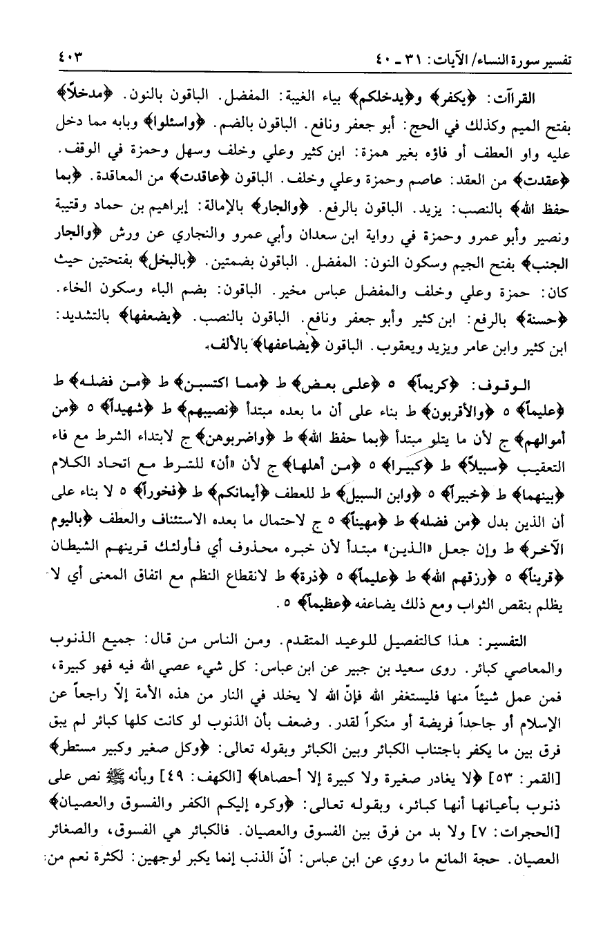 كَرِيماً هـ عَلى بَعْضٍ ط مِمَّا اكْتَسَبْنَ ط مِنْ فَضْلِهِ ط عَلِيماً هـ وَالْأَقْرَبُونَ ط بناء على أن ما بعده مبتدأ نَصِيبَهُمْ ط شَهِيداً هـ مِنْ أَمْوالِهِمْ ج لأن ما يتلو مبتدأ بِما حَفِظَ اللَّهُ ط وَاضْرِبُوهُنَّ ج لابتداء الشرط مع فاء التعقيب سَبِيلًا ط كَبِيراً هـ مِنْ أَهْلِها ج لأن «أن» للشرط مع اتحاد الكلام بَيْنِهِما ط خَبِيراً هـ وَابْنِ السَّبِيلِ ط للعطف أَيْمانُكُمْ ط فَخُوراً هـ لا بناء على أن الذين بدل مِنْ فَضْلِهِ ط مُهِيناً هـ ج لاحتمال ما بعده الاستئناف والعطف بِالْيَوْمِ الْآخِرِ ط وإن جعل «الذين» مبتدأ لأن خبره محذوف أي فأولئك قرينهم الشيطان قَرِيناً هـ رَزَقَهُمُ اللَّهُ ط عَلِيماً هـ ذَرَّةٍ ط لانقطاع النظم مع اتفاق المعنى أي لا يظلم بنقص الثواب ومع ذلك يضاعفه عَظِيماً هـ.