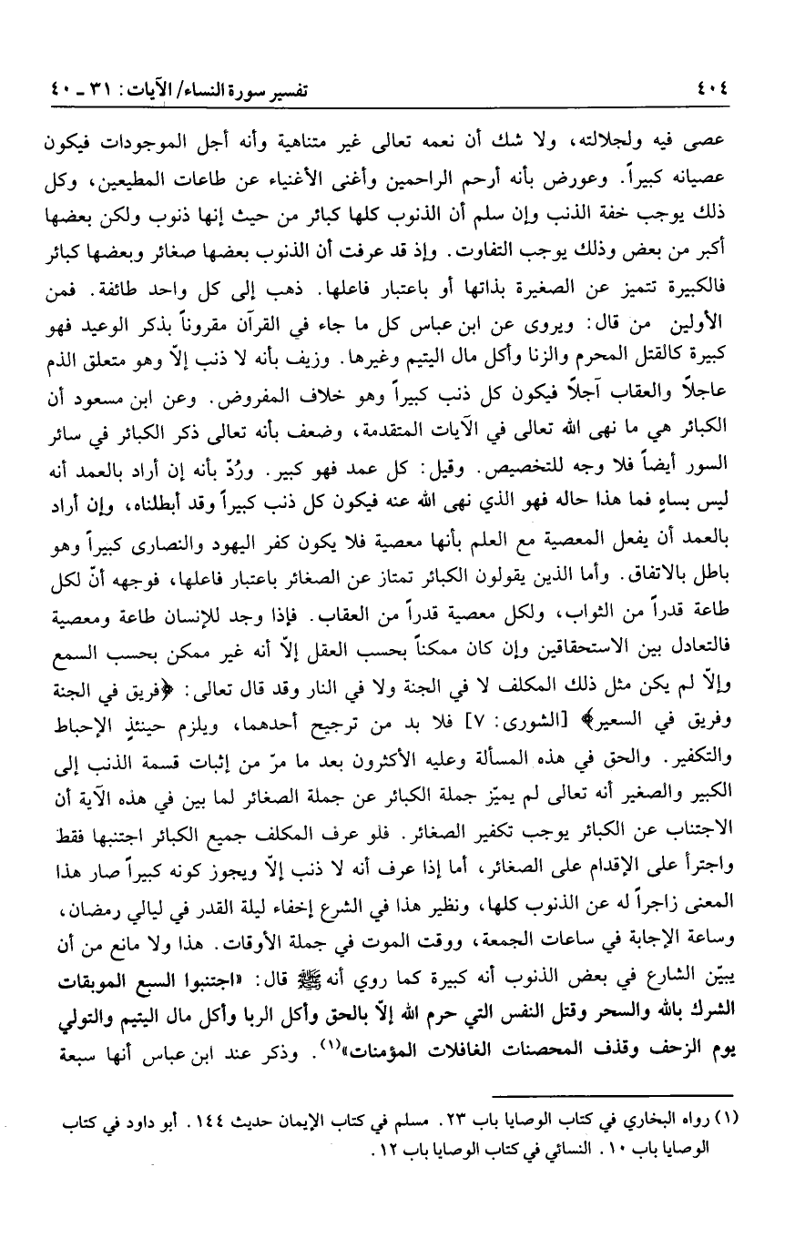 عصى فيه ولجلالته، ولا شك أن نعمه تعالى غير متناهية وأنه أجل الموجودات فيكون عصيانه كبيرا. وعورض بأنه أرحم الراحمين وأغنى الأغنياء عن طاعات المطيعين، وكل ذلك يوجب خفة الذنب وإن سلم أن الذنوب كلها كبائر من حيث إنها ذنوب ولكن بعضها أكبر من بعض وذلك يوجب التفاوت. وإذ قد عرفت أن الذنوب بعضها صغائر وبعضها كبائر فالكبيرة تتميز عن الصغيرة بذاتها أو باعتبار فاعلها. ذهب إلى كل واحد طائفة. فمن الأولين من قال: ويروى عن ابن عباس كل ما جاء في القرآن مقرونا بذكر الوعيد فهو كبيرة كالقتل المحرم والزنا وأكل مال اليتيم وغيرها. وزيف بأنه لا ذنب إلّا وهو متعلق الذم عاجلا والعقاب آجلا فيكون كل ذنب كبيرا وهو خلاف المفروض. وعن ابن مسعود أن الكبائر هي ما نهى الله تعالى في الآيات المتقدمة، وضعف بأنه تعالى ذكر الكبائر في سائر السور أيضا فلا وجه للتخصيص. وقيل: كل عمد فهو كبير. وردّ بأنه إن أراد بالعمد أنه ليس بساه فما هذا حاله فهو الذي نهى الله عنه فيكون كل ذنب كبيرا وقد أبطلناه، وإن أراد بالعمد أن يفعل المعصية مع العلم بأنها معصية فلا يكون كفر اليهود والنصارى كبيرا وهو باطل بالاتفاق. وأما الذين يقولون الكبائر تمتاز عن الصغائر باعتبار فاعلها، فوجهه أنّ لكل طاعة قدرا من الثواب، ولكل معصية قدرا من العقاب. فإذا وجد للإنسان طاعة ومعصية فالتعادل بين الاستحقاقين وإن كان ممكنا بحسب العقل إلّا أنه غير ممكن بحسب السمع وإلّا لم يكن مثل ذلك المكلف لا في الجنة ولا في النار وقد قال تعالى: فَرِيقٌ فِي الْجَنَّةِ وَفَرِيقٌ فِي السَّعِيرِ [الشورى: 7] فلا بد من ترجيح أحدهما، ويلزم حينئذ الإحباط والتكفير. والحق في هذه المسألة وعليه الأكثرون بعد ما مرّ من إثبات قسمة الذنب إلى الكبير والصغير أنه تعالى لم يميّز جملة الكبائر عن جملة الصغائر لما بين في هذه الآية أن الاجتناب عن الكبائر يوجب تكفير الصغائر. فلو عرف المكلف جميع الكبائر اجتنبها فقط واجترأ على الإقدام على الصغائر، أما إذا عرف أنه لا ذنب إلّا ويجوز كونه كبيرا صار هذا المعنى زاجرا له عن الذنوب كلها، ونظير هذا في الشرع إخفاء ليلة القدر في ليالي رمضان، وساعة الإجابة في ساعات الجمعة، ووقت الموت في جملة الأوقات. هذا ولا مانع من أن يبيّن الشارع في بعض الذنوب أنه كبيرة كما