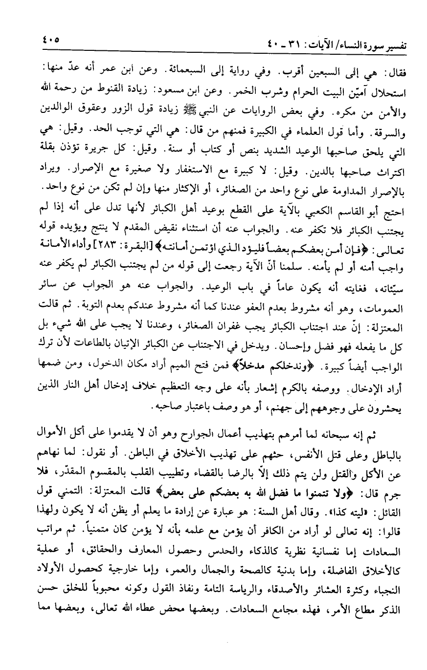 احتج أبو القاسم الكعبي بالآية على القطع بوعيد أهل الكبائر لأنها تدل على أنه إذا لم يجتنب الكبائر فلا تكفر عنه. والجواب عنه أن استثناء نقيض المقدم لا ينتج ويؤيده قوله تعالى: فَإِنْ أَمِنَ بَعْضُكُمْ بَعْضاً فَلْيُؤَدِّ الَّذِي اؤْتُمِنَ أَمانَتَهُ [البقرة: 283] وأداء الأمانة واجب أمنه أو لم يأمنه. سلمنا أنّ الآية رجعت إلى قوله من لم يجتنب الكبائر لم يكفر عنه سيّئاته، فغايته أنه يكون عاما في باب الوعيد. والجواب عنه هو الجواب عن سائر العمومات، وهو أنه مشروط بعدم العفو عندنا كما أنه مشروط عندكم بعدم التوبة. ثم قالت المعتزلة: إنّ عند اجتناب الكبائر يجب غفران الصغائر، وعندنا لا يجب على الله شيء بل كل ما يفعله فهو فضل وإحسان. ويدخل في الاجتناب عن الكبائر الإتيان بالطاعات لأن ترك الواجب أيضا كبيرة. وَنُدْخِلْكُمْ مُدْخَلًا فمن فتح الميم أراد مكان الدخول، ومن ضمها أراد الإدخال. ووصفه بالكرم إشعار بأنه على وجه التعظيم خلاف إدخال أهل النار الذين يحشرون على وجوههم إلى جهنم، أو هو وصف باعتبار صاحبه.