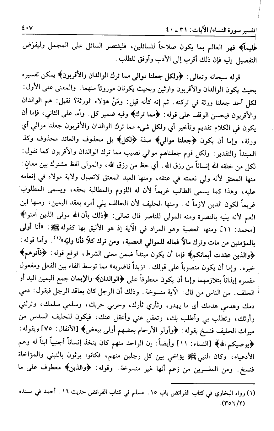قوله سبحانه وتعالى: وَلِكُلٍّ جَعَلْنا مَوالِيَ مِمَّا تَرَكَ الْوالِدانِ وَالْأَقْرَبُونَ يمكن تفسيره.