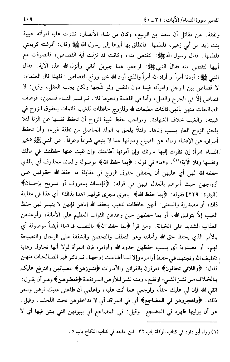 لا قصاص بين الرجل وامرأته فيما دون النفس ولو شجها ولكن يجب العقل، وقيل: لا قصاص إلّا في الجرح والقتل، وأما في اللطمة ونحوها فلا. ثم قسم النساء قسمين، فوصف الصالحات منهن بأنهن قانتات مطيعات لله وللزوج حافظات للغيب قائمات بحقوق الزوج في غيبته، والغيب خلاف الشهادة. ومواجب حفظ غيبة الزوج أن تحفظ نفسها عن الزنا لئلا يلحق الزوج العار بسبب زناها، ولئلّا يلحق به الولد الحاصل من نطفة غيره، وأن تحفظ أسراره عن الإفشاء وماله عن الضياع ومنزلها عما لا ينبغي شرعا وعرفا.