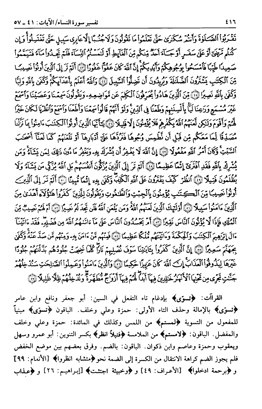 تُسَوَّى بإدغام تاء التفعل في السين: أبو جعفر ونافع وابن عامر تُسَوَّى بالإمالة وحذف التاء الأولى: حمزة وعلي وخلف. الباقون تُسَوَّى مبنيا للمفعول من التسوية لمستم من اللمس وكذلك في المائدة: حمزة وعلي وخلف والمفضل. الباقون: لامَسْتُمُ من الملامسة فَتِيلًا انْظُرْ بكسر التنوين: أبو عمرو وسهل ويعقوب وحمزة وعاصم وابن ذكوان. الباقون: بالضم. وفرق بعضهم بين موضع الخفض فلم يجوز الضم كراهة الانتقال من الكسرة إلى الضمة نحو مُتَشابِهٍ انْظُرُوا [الأنعام: 99] وبِرَحْمَةٍ ادْخُلُوا [الأعراف: 49] وخَبِيثَةٍ اجْتُثَّتْ [إبراهيم: 26] وعَذابٍ