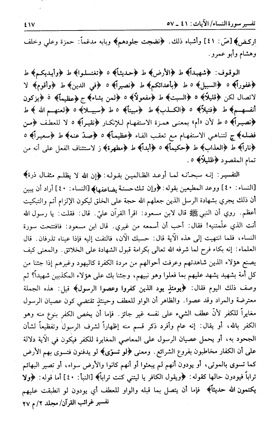 شَهِيداً ط الْأَرْضُ ط حَدِيثاً هـ تَغْتَسِلُوا ط وَأَيْدِيكُمْ ط غَفُوراً هـ السَّبِيلَ هـ ط بِأَعْدائِكُمْ ط نَصِيراً هـ فِي الدِّينِ ط وَأَقْوَمَ لا لاتصال لكن قَلِيلًا هـ السَّبْتِ ط مَفْعُولًا هـ لِمَنْ يَشاءُ ج عَظِيماً هـ يُزَكُّونَ أَنْفُسَهُمْ ط فَتِيلًا هـ الْكَذِبَ ط مُبِيناً هـ ط سَبِيلًا هـ لَعَنَهُمُ اللَّهُ ط نَصِيراً هـ ط لأن «أم» بمعنى همزة الاستفهام للإنكار نَقِيراً هـ لا للعطف مِنْ فَضْلِهِ ج لتناهي الاستفهام مع تعقب الفاء عَظِيماً هـ صَدَّ عَنْهُ ط سَعِيراً هـ ناراً ط الْعَذابَ ط حَكِيماً هـ أَبَداً ط مُطَهَّرَةٌ ز لاستئناف الفعل على أنه من تمام المقصود ظَلِيلًا هـ.