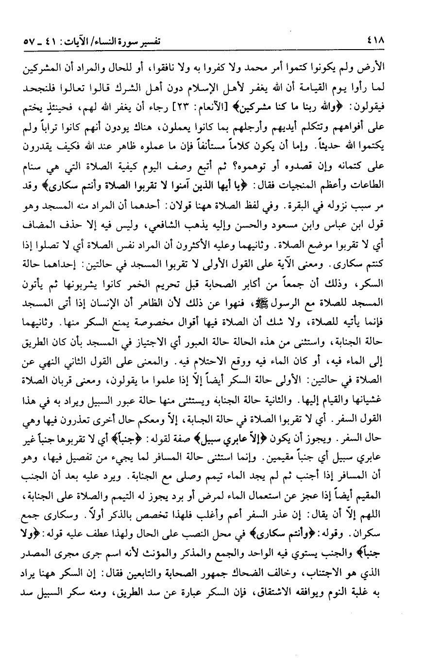 الأرض ولم يكونوا كتموا أمر محمد ولا كفروا به ولا نافقوا، أو للحال والمراد أن المشركين لما رأوا يوم القيامة أن الله يغفر لأهل الإسلام دون أهل الشرك قالوا تعالوا فلنجحد فيقولون: وَاللَّهِ رَبِّنا ما كُنَّا مُشْرِكِينَ [الأنعام: 23] رجاء أن يغفر الله لهم، فحينئذ يختم على أفواههم وتتكلم أيديهم وأرجلهم بما كانوا يعملون، هناك يودون أنهم كانوا ترابا ولم يكتموا الله حديثا. وإما أن يكون كلاما مستأنفا فإن ما عملوه ظاهر عند الله فكيف يقدرون على كتمانه وإن قصدوه أو توهموه؟ ثم أتبع وصف اليوم كيفية الصلاة التي هي سنام الطاعات وأعظم المنجيات فقال: يا أَيُّهَا الَّذِينَ آمَنُوا لا تَقْرَبُوا الصَّلاةَ وَأَنْتُمْ سُكارى وقد مر سبب نزوله في البقرة. وفي لفظ الصلاة هاهنا قولان: أحدهما أن المراد منه المسجد وهو قول ابن عباس وابن مسعود والحسن وإليه يذهب الشافعي، وليس فيه إلا حذف المضاف أي لا تقربوا موضع الصلاة. وثانيهما وعليه الأكثرون أن المراد نفس الصلاة أي لا تصلوا إذا كنتم سكارى. ومعنى الآية على القول الأولى لا تقربوا المسجد في حالتين: إحداهما حالة السكر، وذلك أن جمعا من أكابر الصحابة قبل تحريم الخمر كانوا يشربونها ثم يأتون المسجد للصلاة مع الرسول صلى الله عليه وسلم، فنهوا عن ذلك لأن الظاهر أن الإنسان إذا أتى المسجد فإنما يأتيه للصلاة، ولا شك أن الصلاة فيها أقوال مخصوصة يمنع السكر منها. وثانيهما حالة الجنابة، واستثنى من هذه الحالة حالة العبور أي الاجتياز في المسجد بأن كان الطريق إلى الماء فيه، أو كان الماء فيه ووقع الاحتلام فيه. والمعنى على القول الثاني النهي عن الصلاة في حالتين: الأولى حالة السكر أيضا إلّا إذا علموا ما يقولون، ومعنى قربان الصلاة غشيانها والقيام إليها. والثانية حالة الجنابة ويستثنى منها حالة عبور السبيل ويراد به في هذا القول السفر. أي لا تقربوا الصلاة في حالة الجنابة، إلّا ومعكم حال أخرى تعذرون فيها وهي حال السفر. ويجوز أن يكون إِلَّا عابِرِي سَبِيلٍ صفة لقوله: جُنُباً أي لا تقربوها جنبا غير عابري سبيل أي جنبا مقيمين. وإنما استثنى حالة المسافر لما يجيء من تفصيل فيها، وهو أن المسافر إذا أجنب ثم لم يجد الماء تيمم وصلى مع الجنابة. ويرد عليه بعد أن الجنب المقيم أيضا إذا عجز عن استعمال الماء لمرض أو برد يجوز له التيمم والصلاة على الجنابة، اللهم إلّا أن يقال: إن عذر السفر أعم وأغلب فلهذا تخصص بالذكر أولا. وسكارى جمع سكران. وقوله: وَأَنْتُمْ سُكارى في محل النصب على الحال ولهذا عطف عليه قوله: وَلا جُنُباً والجنب يستوي فيه الواحد والجمع والمذكر والمؤنث لأنه اسم جرى مجرى المصدر الذي هو الاجتناب، وخالف الضحاك جمهور الصحابة والتابعين فقال: إن السكر هاهنا يراد به غلبة النوم ويوافقه الاشتقاق، فإن السكر عبارة عن سد الطريق، ومنه سكر السبيل سد