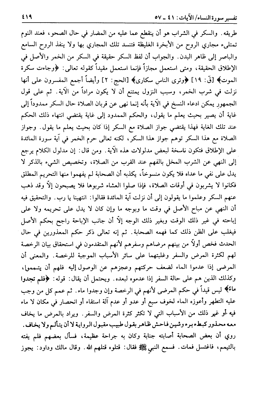 [الحج: 2] وأيضا أجمع المفسرون على أنها نزلت في شرب الخمر، وسبب النزول يمتنع أن لا يكون مرادا من الآية. ثم على قول الجمهور يمكن ادعاء النسخ في الآية بأنه إنما نهى عن قربان الصلاة حال السكر ممدودا إلى غاية أن يصير بحيث يعلم ما يقول، والحكم الممدود إلى غاية يقتضي انتهاء ذلك الحكم عند تلك الغاية فهذا يقتضي جواز الصلاة مع السكر إذا كان بحيث يعلم ما يقول. وجواز الصلاة مع هذا السكر توهم جواز هذا السكر، لكنه تعالى حرم الخمر في آية سورة المائدة على الإطلاق فتكون ناسخة لبعض مدلولات هذه الآية. ومن قال: إن مدلول الكلام يرجع إلى النهي عن الشرب المخل بالفهم عند القرب من الصلاة، وتخصيص الشيء بالذكر لا يدل على نفي ما عداه فلا يكون منسوخا، يكذبه أن الصحابة لم يفهموا منها التحريم المطلق فكانوا لا يشربون في أوقات الصلاة، فإذا صلوا العشاء شربوها فلا يصبحون إلّا وقد ذهب عنهم السكر وعلموا ما يقولون إلى أن نزلت آية المائدة فقالوا: انتهينا يا رب. والتحقيق فيه أن النهي عن مباح الأصل في وقت ما وبوجه ما وإن كان لا يدل على تحريمه ولا على إباحته في غير ذلك الوقت وبغير ذلك الوجه إلّا أن جانب الإباحة راجح بحكم الأصل فيغلب على الظن ذلك كما فهمه الصحابة. ثم إنه تعالى ذكر حكم المعذورين في حال الحدث فخص أولا من بينهم مرضاهم وسفرهم لأنهم المتقدمون في استحقاق بيان الرخصة لهم لكثرة المرض والسفر وغلبتهما على سائر الأسباب الموجبة للرخصة. والمعنى أن المرضى إذا عدموا الماء لضعف حركتهم وعجزهم عن الوصول إليه فلهم أن يتمموا، وكذلك الذين هم على حالة السفر إذا عدموه لبعده. ويحتمل أن يقال: قوله: فَلَمْ تَجِدُوا ماءً ليس قيدا في حكم المرضى لأنهم في الرخصة وإن وجدوا ماء. ثم عمم كل من وجب عليه التطهر وأعوزه الماء لخوف سبع أو عدو أو عدم آلة استقاء أو انحصار في مكان لا ماء فيه أو غير ذلك من الأسباب التي لا تكثر كثرة المرض والسفر. ويراد بالمرض ما يخاف معه محذور كبطء برء وشين فاحش ظاهر بقول طبيب مقبول الرواية لا أن يتألم ولا يخاف.