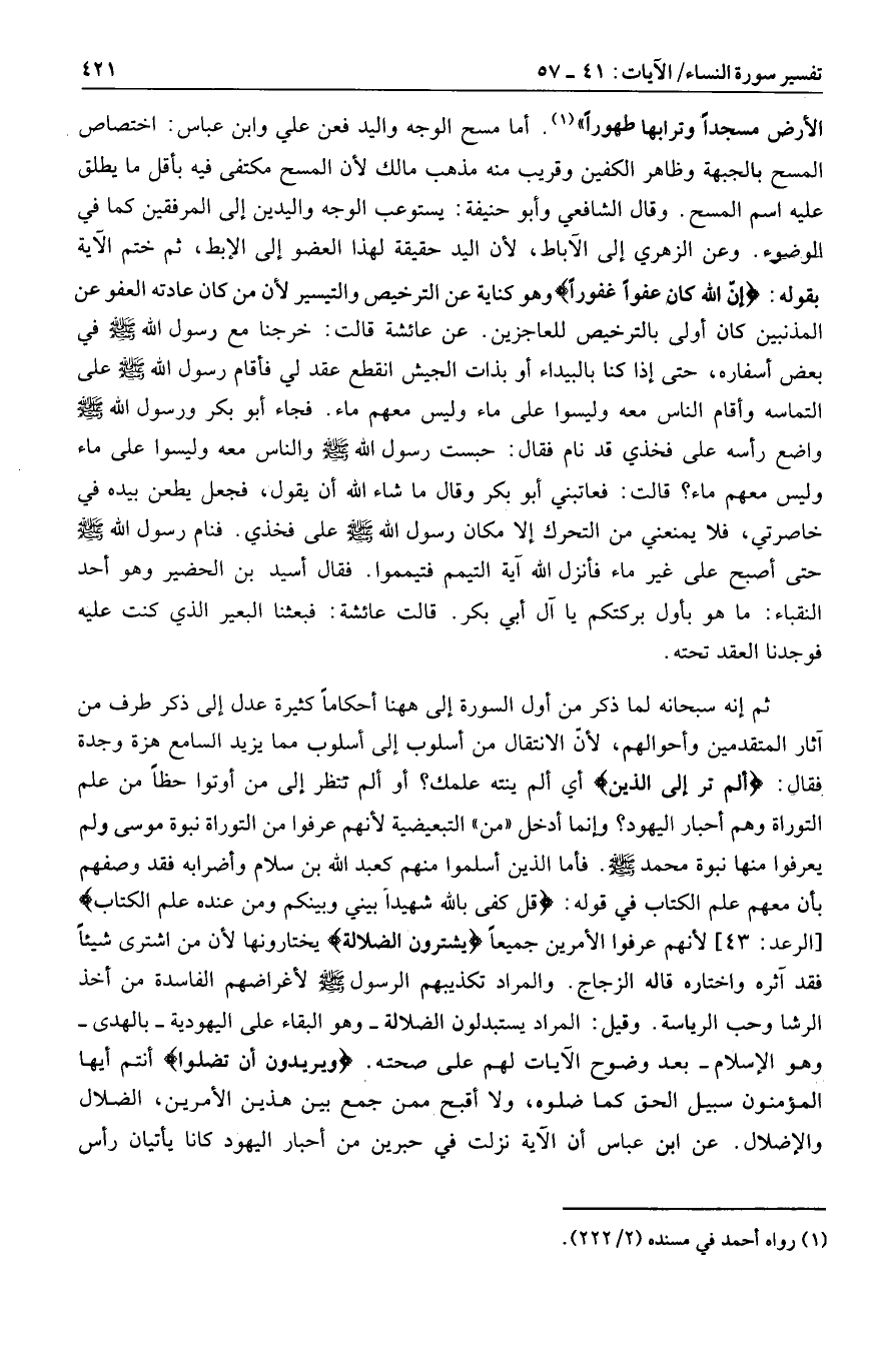 أما مسح الوجه واليد فعن علي وابن عباس: اختصاص المسح بالجبهة وظاهر الكفين وقريب منه مذهب مالك لأن المسح مكتفى فيه بأقل ما يطلق عليه اسم المسح. وقال الشافعي وأبو حنيفة: يستوعب الوجه واليدين إلى المرفقين كما في الوضوء. وعن الزهري إلى الآباط، لأن اليد حقيقة لهذا العضو إلى الإبط، ثم ختم الآية بقوله: إِنَّ اللَّهَ كانَ عَفُوًّا غَفُوراً وهو كناية عن الترخيص والتيسير لأن من كان عادته العفو عن المذنبين كان أولى بالترخيص للعاجزين.