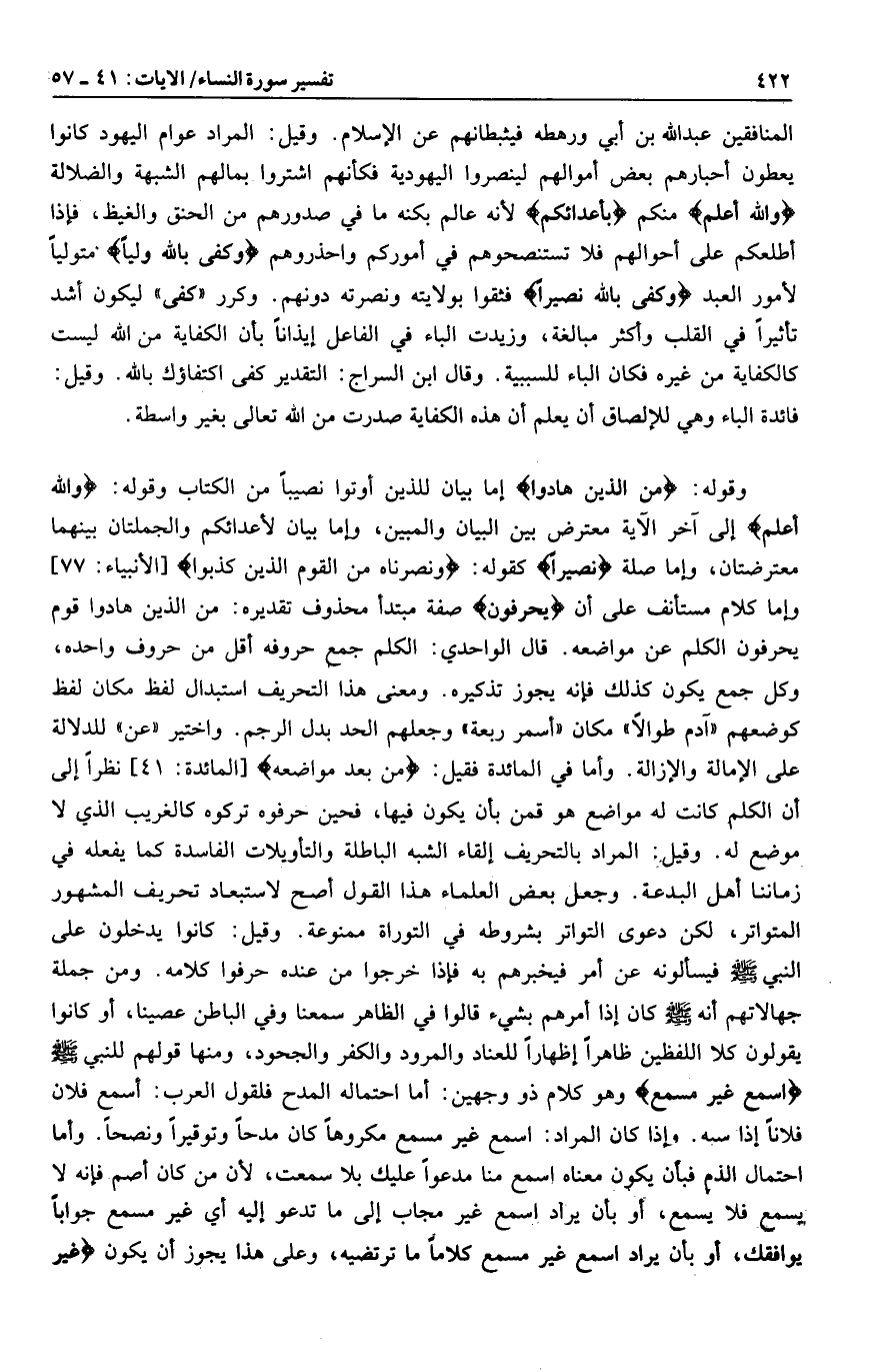 المنافقين عبد الله بن أبي ورهطه فيثبطانهم عن الإسلام. وقيل: المراد عوام اليهود كانوا يعطون أحبارهم بعض أموالهم لينصروا اليهودية فكأنهم اشتروا بمالهم الشبهة والضلالة وَاللَّهُ أَعْلَمُ منكم بِأَعْدائِكُمْ لأنه عالم بكنه ما في صدورهم من الحنق والغيظ، فإذا أطلعكم على أحوالهم فلا تستنصحوهم في أموركم واحذروهم وَكَفى بِاللَّهِ وَلِيًّا متوليا لأمور العبد وَكَفى بِاللَّهِ نَصِيراً فثقوا بولايته ونصرته دونهم. وكرر «كفى» ليكون أشد تأثيرا في القلب وأكثر مبالغة، وزيدت الباء في الفاعل إيذانا بأن الكفاية من الله ليست كالكفاية من غيره فكان الباء للسببية. وقال ابن السراج: التقدير كفى اكتفاؤك بالله. وقيل: