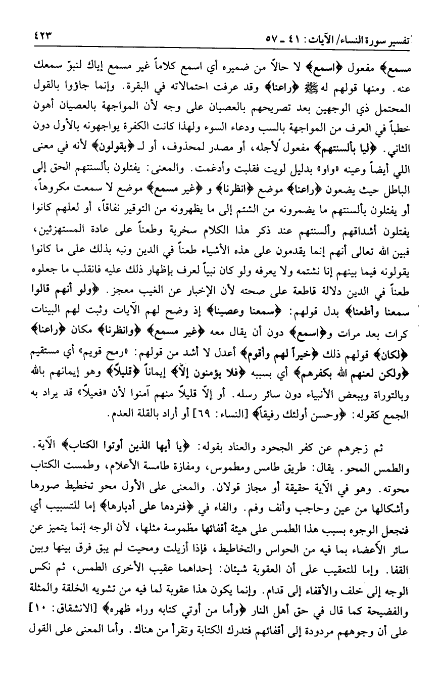 مفعول اسْمَعْ لا حالا من ضميره أي اسمع كلاما غير مسمع إياك لنبوّ سمعك عنه. ومنها قولهم له صلى الله عليه وسلم راعِنا وقد عرفت احتمالاته في البقرة. وإنما جاؤوا بالقول المحتمل ذي الوجهين بعد تصريحهم بالعصيان على وجه لأن المواجهة بالعصيان أهون خطبا في العرف من المواجهة بالسب ودعاء السوء ولهذا كانت الكفرة يواجهونه بالأول دون الثاني. لَيًّا بِأَلْسِنَتِهِمْ مفعول لأجله، أو مصدر لمحذوف، أو ل يَقُولُونَ لأنه في معنى اللي أيضا وعينه «واو» بدليل لويت فقلبت وأدغمت. والمعنى: يفتلون بألسنتهم الحق إلى الباطل حيث يضعون راعِنا موضع انْظُرْنا وغَيْرَ مُسْمَعٍ موضع لا سمعت مكروها، أو يفتلون بألسنتهم ما يضمرونه من الشتم إلى ما يظهرونه من التوقير نفاقا، أو لعلهم كانوا يفتلون أشداقهم وألسنتهم عند ذكر هذا الكلام سخرية وطعنا على عادة المستهزئين، فبين الله تعالى أنهم إنما يقدمون على هذه الأشياء طعنا في الدين ونبه بذلك على ما كانوا يقولونه فيما بينهم إنا نشتمه ولا يعرفه ولو كان نبيا لعرف بإظهار ذلك عليه فانقلب ما جعلوه طعنا في الدين دلالة قاطعة على صحته لأن الإخبار عن الغيب معجز. وَلَوْ أَنَّهُمْ قالُوا سَمِعْنا وَأَطَعْنا بدل قولهم: سَمِعْنا وَعَصَيْنا إذ وضح لهم الآيات وثبت لهم البينات كرات بعد مرات واسْمَعْ دون أن يقال معه غَيْرَ مُسْمَعٍ وَانْظُرْنا مكان راعِنا لَكانَ قولهم ذلك خَيْراً لَهُمْ وَأَقْوَمَ أعدل لا أشد من قولهم: «رمح قويم» أي مستقيم وَلكِنْ لَعَنَهُمُ اللَّهُ بِكُفْرِهِمْ أي بسببه فَلا يُؤْمِنُونَ إِلَّا إيمانا قَلِيلًا وهو إيمانهم بالله وبالتوراة وببعض الأنبياء دون سائر رسله. أو إلّا قليلا منهم آمنوا لأن «فعيلا» قد يراد به الجمع كقوله: وَحَسُنَ أُولئِكَ رَفِيقاً [النساء: 69] أو أراد بالقلة العدم.