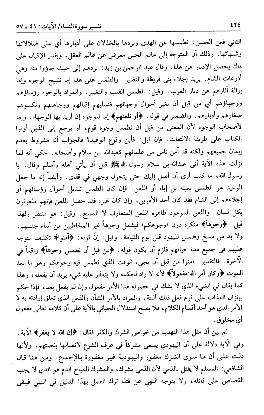 الثاني فعن الحسن: نطمسها عن الهدى ونردها بالخذلان على أدبارها أي على ضلالاتها وشبهاتها. وذلك أن المتوجه إلى عالم الحس معرض عن عالم العقل، وبقدر الإقبال على ذاك يحصل الإدبار عن هذا. وقال عبد الرحمن بن زيد: نردهم إلى حيث جاؤوا منه وهي أذرعات الشام. يريد إجلاء بني قريظة والنضير. والطمس على هذا إما تقبيح الوجوه وإما إزالة آثارهم عن ديار العرب. وقيل: الطمس القلب والتغيير. والمراد بالوجوه رؤساؤهم ووجهاؤهم أي من قبل أن نغير أحوال وجهائهم فنسلبهم إقبالهم ووجاهتهم ونكسوهم صغارهم وأدبارهم. والضمير في قوله: أَوْ نَلْعَنَهُمْ إما للوجوه إن أريد بها الوجهاء، وإما لأصحاب الوجوه لأن المعنى من قبل أن نطمس وجوه قوم، أو يرجع إلى الذين أوتوا الكتاب على طريقة الالتفات. فإن قيل: فأين وقوع الوعيد؟ فالجواب أنه مشروط بعدم إيمان جميعهم ولكنه قد آمن ناس من علمائهم كعبد الله بن سلام وأصحابه. حكي أنه لما نزلت هذه الآية أتى عبد الله بن سلام رسول الله صلى الله عليه وسلم قبل أن يأتي أهله وأسلم وقال: يا رسول الله، ما كنت أرى أن أصل إليك حتى يتحول وجهي في قفاي. وأيضا إنه ما جعل الوعيد هو الطمس بعينه بل إياه أو اللعن. فإن كان الطمس تبديل أحوال رؤسائهم أو إجلاءهم إلى الشام فقد كان أحد الأمرين، وإن كان غيره فقد حصل اللعن فإنهم ملعونون بكل لسان. واللعن الموعود ظاهره اللعن المتعارف لا المسخ. وقيل: هو منتظر ولهذا قيل: وُجُوهاً منكرة دون «وجوهكم» ليشمل وجوها غير المخاطبين من أبناء جنسهم، ولا بد من مسخ وطمس لليهود قبل يوم القيامة. وقيل: إنّ قوله: آمِنُوا تكليف متوجه عليهم في جميع مدة حياتهم فلزم أن يكون قوله: مِنْ قَبْلِ أَنْ نَطْمِسَ وُجُوهاً واقعا في الآخرة. فالتقدير: آمنوا من قبل أن يجيء الوقت الذي نطمس فيه وجوهكم وهو ما بعد الموت وَكانَ أَمْرُ اللَّهِ مَفْعُولًا لأنه لا راد لحكمه ولا يتعذر عليه شيء يريد أن يفعله، وهذا كما يقال في الشيء الذي لا يشك في حصوله هذا الأمر مفعول وإن لم يفعل بعد، فإذا حكم بإنزال العذاب على قوم فعل ذلك البتة. والمراد بالأمر الشأن والفعل الذي تعلق إرادته به لا الأمر الذي هو أحد أقسام الكلام، فلا يصح استدلال الجبائي بالآية على أن كلامه تعالى مفعول أي مخلوق.