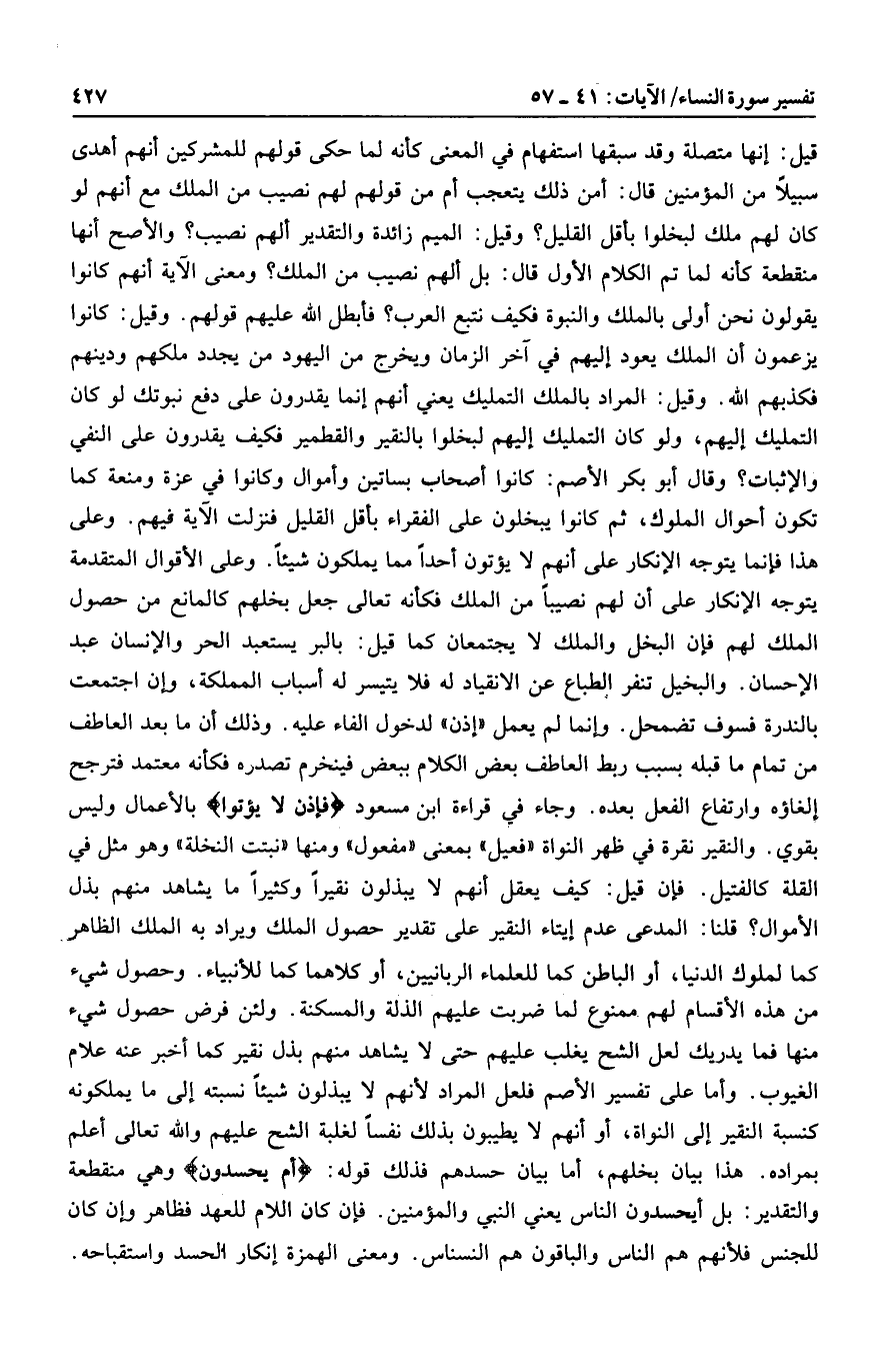 قيل: إنها متصلة وقد سبقها استفهام في المعنى كأنه لما حكى قولهم للمشركين أنهم أهدى سبيلا من المؤمنين قال: أمن ذلك يتعجب أم من قولهم لهم نصيب من الملك مع أنهم لو كان لهم ملك لبخلوا بأقل القليل؟ وقيل: الميم زائدة والتقدير ألهم نصيب؟ والأصح أنها منقطعة كأنه لما تم الكلام الأول قال: بل ألهم نصيب من الملك؟ ومعنى الآية أنهم كانوا يقولون نحن أولى بالملك والنبوة فكيف نتبع العرب؟ فأبطل الله عليهم قولهم. وقيل: كانوا يزعمون أن الملك يعود إليهم في آخر الزمان ويخرج من اليهود من يجدد ملكهم ودينهم فكذبهم الله. وقيل: المراد بالملك التمليك يعني أنهم إنما يقدرون على دفع نبوتك لو كان التمليك إليهم، ولو كان التمليك إليهم لبخلوا بالنقير والقطمير فكيف يقدرون على النفي والإثبات؟ وقال أبوبكر الأصم: كانوا أصحاب بساتين وأموال وكانوا في عزة ومنعة كما تكون أحوال الملوك، ثم كانوا يبخلون على الفقراء بأقل القليل فنزلت الآية فيهم. وعلى هذا فإنما يتوجه الإنكار على أنهم لا يؤتون أحدا مما يملكون شيئا. وعلى الأقوال المتقدمة يتوجه الإنكار على أن لهم نصيبا من الملك فكأنه تعالى جعل بخلهم كالمانع من حصول الملك لهم فإن البخل والملك لا يجتمعان كما قيل: بالبر يستعبد الحر والإنسان عبد الإحسان. والبخيل تنفر الطباع عن الانقياد له فلا يتيسر له أسباب المملكة، وإن اجتمعت بالندرة فسوف تضمحل. وإنما لم يعمل «إذن» لدخول الفاء عليه. وذلك أن ما بعد العاطف من تمام ما قبله بسبب ربط العاطف بعض الكلام ببعض فينخرم تصدره فكأنه معتمد فترجح إلغاؤه وارتفاع الفعل بعده. وجاء في قراءة ابن مسعود فإذن لا يؤتوا بالأعمال وليس بقوي. والنقير نقرة في ظهر النواة «فعيل» بمعنى «مفعول» ومنها «نبتت النخلة» وهو مثل في القلة كالفتيل. فإن قيل: كيف يعقل أنهم لا يبذلون نقيرا وكثيرا ما يشاهد منهم بذل الأموال؟ قلنا: المدعى عدم إيتاء النقير على تقدير حصول الملك ويراد به الملك الظاهر كما لملوك الدنيا، أو الباطن كما للعلماء الربانيين، أو كلاهما كما للأنبياء. وحصول شيء من هذه الأقسام لهم ممنوع لما ضربت عليهم الذلة والمسكنة. ولئن فرض حصول شيء منها فما يدريك لعل الشح يغلب عليهم حتى لا يشاهد منهم بذل نقير كما أخبر عنه علام الغيوب. وأما على تفسير الأصم فلعل المراد لأنهم لا يبذلون شيئا نسبته إلى ما يملكونه كنسبة النقير إلى النواة، أو أنهم لا يطيبون بذلك نفسا لغلبة الشح عليهم والله تعالى أعلم بمراده. هذا بيان بخلهم، أما بيان حسدهم فذلك قوله: أَمْ يَحْسُدُونَ وهي منقطعة والتقدير: بل أيحسدون الناس يعني النبي والمؤمنين. فإن كان اللام للعهد فظاهر وإن كان للجنس فلأنهم هم الناس والباقون هم النسناس. ومعنى الهمزة إنكار الحسد واستقباحه.