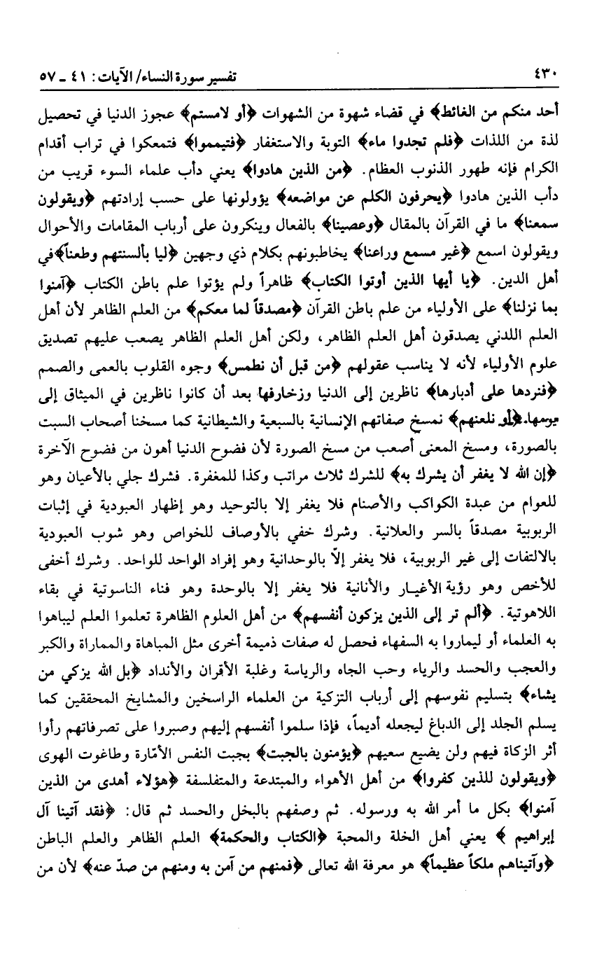 أَوْ جاءَ أَحَدٌ مِنْكُمْ مِنَ الْغائِطِ في قضاء شهوة من الشهوات أَوْ لامَسْتُمُ عجوز الدنيا في تحصيل لذة من اللذات فَلَمْ تَجِدُوا ماءً التوبة والاستغفار فَتَيَمَّمُوا فتمعكوا في تراب أقدام الكرام فإنه طهور الذنوب العظام. مِنَ الَّذِينَ هادُوا يعني دأب علماء السوء قريب من دأب الذين هادوا يُحَرِّفُونَ الْكَلِمَ عَنْ مَواضِعِهِ يؤولونها على حسب إرادتهم وَيَقُولُونَ سَمِعْنا ما في القرآن بالمقال وَعَصَيْنا بالفعال وينكرون على أرباب المقامات والأحوال ويقولون اسمع غَيْرَ مُسْمَعٍ وَراعِنا يخاطبونهم بكلام ذي وجهين لَيًّا بِأَلْسِنَتِهِمْ وَطَعْناً في أهل الدين. يا أَيُّهَا الَّذِينَ أُوتُوا الْكِتابَ ظاهرا ولم يؤتوا علم باطن الكتاب آمِنُوا بِما نَزَّلْنا على الأولياء من علم باطن القرآن مُصَدِّقاً لِما مَعَكُمْ من العلم الظاهر لأن أهل العلم اللدني يصدقون أهل العلم الظاهر، ولكن أهل العلم الظاهر يصعب عليهم تصديق علوم الأولياء لأنه لا يناسب عقولهم مِنْ قَبْلِ أَنْ نَطْمِسَ وجوه القلوب بالعمى والصمم فَنَرُدَّها عَلى أَدْبارِها ناظرين إلى الدنيا وزخارفها بعد أن كانوا ناظرين في الميثاق إلى يومها أَوْ نَلْعَنَهُمْ نمسخ صفاتهم الإنسانية بالسبعية والشيطانية كما مسخنا أصحاب السبت بالصورة، ومسخ المعنى أصعب من مسخ الصورة لأن فضوح الدنيا أهون من فضوح الآخرة إِنَّ اللَّهَ لا يَغْفِرُ أَنْ يُشْرَكَ بِهِ للشرك ثلاث مراتب وكذا للمغفرة. فشرك جلي بالأعيان وهو للعوام من عبدة الكواكب والأصنام فلا يغفر إلا بالتوحيد وهو إظهار العبودية في إثبات الربوبية مصدقا بالسر والعلانية. وشرك خفي بالأوصاف للخواص وهو شوب العبودية بالالتفات إلى غير الربوبية، فلا يغفر إلّا بالوحدانية وهو إفراد الواحد للواحد. وشرك أخفى للأخص وهو رؤية الأغيار والأنانية فلا يغفر إلا بالوحدة وهو فناء الناسوتية في بقاء اللاهوتية. أَلَمْ تَرَ إِلَى الَّذِينَ يُزَكُّونَ أَنْفُسَهُمْ من أهل العلوم الظاهرة تعلموا العلم ليباهوا به العلماء أو ليماروا به السفهاء فحصل له صفات ذميمة أخرى مثل المباهاة والمماراة والكبر والعجب والحسد والرياء وحب الجاه والرياسة وغلبة الأقران والأنداد بَلِ اللَّهُ يُزَكِّي مَنْ يَشاءُ بتسليم نفوسهم إلى أرباب التزكية من العلماء الراسخين والمشايخ المحققين كما يسلم الجلد إلى الدباغ ليجعله أديما، فإذا سلموا أنفسهم إليهم وصبروا على تصرفاتهم رأوا أثر الزكاة فيهم ولن يضيع سعيهم يُؤْمِنُونَ بِالْجِبْتِ بجبت النفس الأمّارة وطاغوت الهوى وَيَقُولُونَ لِلَّذِينَ كَفَرُوا من أهل الأهواء والمبتدعة والمتفلسفة هؤُلاءِ أَهْدى مِنَ الَّذِينَ آمَنُوا بكل ما أمر الله به ورسوله. ثم وصفهم بالبخل والحسد ثم قال: فَقَدْ آتَيْنا آلَ إِبْراهِيمَ يعني أهل الخلة والمحبة الْكِتابَ وَالْحِكْمَةَ العلم الظاهر والعلم الباطن وَآتَيْناهُمْ مُلْكاً عَظِيماً هو معرفة الله تعالى فَمِنْهُمْ مَنْ آمَنَ بِهِ وَمِنْهُمْ مَنْ صَدَّ عَنْهُ لأن من