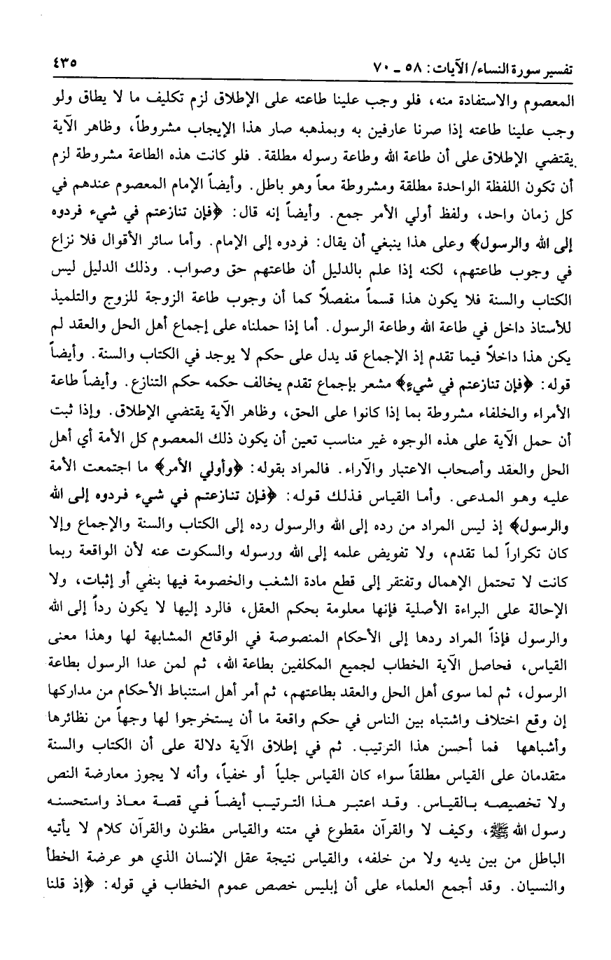 المعصوم والاستفادة منه، فلو وجب علينا طاعته على الإطلاق لزم تكليف ما لا يطاق ولو وجب علينا طاعته إذا صرنا عارفين به وبمذهبه صار هذا الإيجاب مشروطا، وظاهر الآية يقتضي الإطلاق على أن طاعة الله وطاعة رسوله مطلقة. فلو كانت هذه الطاعة مشروطة لزم أن تكون اللفظة الواحدة مطلقة ومشروطة معا وهو باطل. وأيضا الإمام المعصوم عندهم في كل زمان واحد، ولفظ أولي الأمر جمع. وأيضا إنه قال: فَإِنْ تَنازَعْتُمْ فِي شَيْءٍ فَرُدُّوهُ إِلَى اللَّهِ وَالرَّسُولِ وعلى هذا ينبغي أن يقال: فردوه إلى الإمام. وأما سائر الأقوال فلا نزاع في وجوب طاعتهم، لكنه إذا علم بالدليل أن طاعتهم حق وصواب. وذلك الدليل ليس الكتاب والسنة فلا يكون هذا قسما منفصلا كما أن وجوب طاعة الزوجة للزوج والتلميذ للأستاذ داخل في طاعة الله وطاعة الرسول. أما إذا حملناه على إجماع أهل الحل والعقد لم يكن هذا داخلا فيما تقدم إذ الإجماع قد يدل على حكم لا يوجد في الكتاب والسنة. وأيضا قوله: فَإِنْ تَنازَعْتُمْ فِي شَيْءٍ مشعر بإجماع تقدم يخالف حكمه حكم التنازع. وأيضا طاعة الأمراء والخلفاء مشروطة بما إذا كانوا على الحق، وظاهر الآية يقتضي الإطلاق. وإذا ثبت أن حمل الآية على هذه الوجوه غير مناسب تعين أن يكون ذلك المعصوم كل الأمة أي أهل الحل والعقد وأصحاب الاعتبار والآراء. فالمراد بقوله: وَأُولِي الْأَمْرِ ما اجتمعت الأمة عليه وهو المدعى. وأما القياس فذلك قوله: فَإِنْ تَنازَعْتُمْ فِي شَيْءٍ فَرُدُّوهُ إِلَى اللَّهِ وَالرَّسُولِ إذ ليس المراد من رده إلى الله والرسول رده إلى الكتاب والسنة والإجماع وإلا كان تكرارا لما تقدم، ولا تفويض علمه إلى الله ورسوله والسكوت عنه لأن الواقعة ربما كانت لا تحتمل الإهمال وتفتقر إلى قطع مادة الشغب والخصومة فيها بنفي أو إثبات، ولا الإحالة على البراءة الأصلية فإنها معلومة بحكم العقل، فالرد إليها لا يكون ردا إلى الله والرسول فإذا المراد ردها إلى الأحكام المنصوصة في الوقائع المشابهة لها وهذا معنى القياس، فحاصل الآية الخطاب لجميع المكلفين بطاعة الله، ثم لمن عدا الرسول بطاعة الرسول، ثم لما سوى أهل الحل والعقد بطاعتهم، ثم أمر أهل استنباط الأحكام من مداركها إن وقع اختلاف واشتباه بين الناس في حكم واقعة ما أن يستخرجوا لها وجها من نظائرها وأشباهها فما أحسن هذا الترتيب. ثم في إطلاق الآية دلالة على أن الكتاب والسنة متقدمان على القياس مطلقا سواء كان القياس جليا أو خفيا، وأنه لا يجوز معارضة النص ولا تخصيصه بالقياس. وقد اعتبر هذا الترتيب أيضا في قصة معاذ واستحسنه رسول الله صلى الله عليه وسلم، وكيف لا والقرآن مقطوع في متنه والقياس مظنون والقرآن كلام لا يأتيه الباطل من بين يديه ولا من خلفه، والقياس نتيجة عقل الإنسان الذي هو عرضة الخطأ والنسيان. وقد أجمع العلماء على أن إبليس خصص عموم الخطاب في قوله: إِذْ قُلْنا