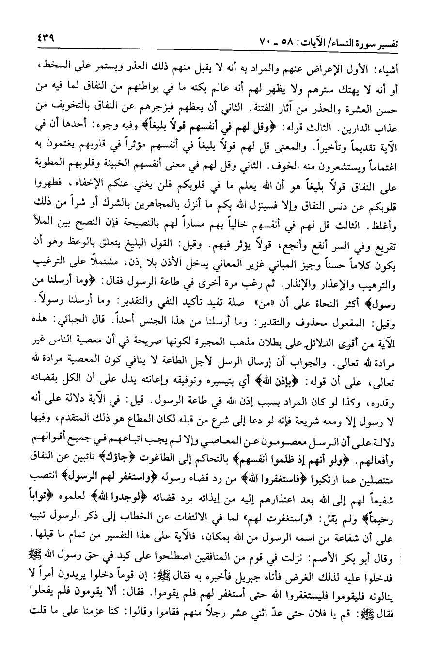أشياء: الأول الإعراض عنهم والمراد به أنه لا يقبل منهم ذلك العذر ويستمر على السخط، أو أنه لا يهتك سترهم ولا يظهر لهم أنه عالم بكنه ما في بواطنهم من النفاق لما فيه من حسن العشرة والحذر من آثار الفتنة. الثاني أن يعظهم فيزجرهم عن النفاق بالتخويف من عذاب الدارين. الثالث قوله: وَقُلْ لَهُمْ فِي أَنْفُسِهِمْ قَوْلًا بَلِيغاً وفيه وجوه: أحدها أن في الآية تقديما وتأخيرا. والمعنى قل لهم قولا بليغا في أنفسهم مؤثرا في قلوبهم يغتمون به اغتماما ويستشعرون منه الخوف. الثاني وقل لهم في معنى أنفسهم الخبيثة وقلوبهم المطوية على النفاق قولا بليغا هو أن الله يعلم ما في قلوبكم فلن يغني عنكم الإخفاء، فطهروا قلوبكم عن دنس النفاق وإلا فسينزل الله بكم ما أنزل بالمجاهرين بالشرك أو شرا من ذلك وأغلظ. الثالث قل لهم في أنفسهم خاليا بهم مسارا لهم بالنصيحة فإن النصح بين الملأ تقريع وفي السر أنفع وأنجع، قولا يؤثر فيهم. وقيل: القول البليغ يتعلق بالوعظ وهو أن يكون كلاما حسنا وجيز المباني غزير المعاني يدخل الأذن بلا إذن، مشتملا على الترغيب والترهيب والإعذار والإنذار. ثم رغب مرة أخرى في طاعة الرسول فقال: وَما أَرْسَلْنا مِنْ رَسُولٍ أكثر النحاة على أن «من» صلة تفيد تأكيد النفي والتقدير: وما أرسلنا رسولا.