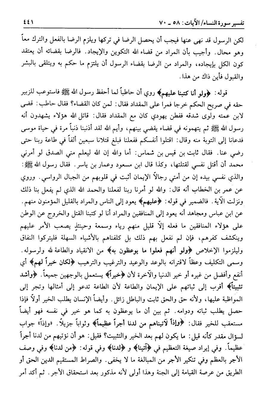 وسمى التكليف وعظا لاقترانه بالوعد والوعيد والترغيب والترهيب لَكانَ خَيْراً لَهُمْ أي أنفع وأفضل من غيره أو خير الدنيا والآخرة لأن خَيْراً يستعمل بالوجهين جميعا. وَأَشَدَّ تَثْبِيتاً أقرب إلى ثباتهم على الإيمان والطاعة لأن الطاعة تدعو إلى أمثالها وتجر إلى المواظبة عليها، ولأنه حق والحق ثابت والباطل زائل. وأيضا الإنسان يطلب الخير أولا فإذا حصل يطلب ثباته ودوامه. ثم بين أن ما يوعظون به كما هو خير في نفسه فهو أيضا مستعقب للخير فقال: وَإِذاً لَآتَيْناهُمْ مِنْ لَدُنَّا أَجْراً عَظِيماً وثوابا جزيلا. «وإذا» جواب لسؤال مقدر كأنه قيل: ما يكون لهم بعد الخير والتثبيت؟ فقيل: هو أن نؤتيهم من لدنا أجرا عظيما. وفي إيراد صيغة التعظيم في لَآتَيْناهُمْ ولَدُنَّا وفي قوله: مِنْ لَدُنَّا وفي وصف الأجر بالعظم وفي تنكير الأجر من المبالغة ما لا يخفى. والصراط المستقيم الدين الحق أو الطريق من عرصة القيامة إلى الجنة وهذا أولى لأنه مذكور بعد استحقاق الأجر. ثم أكد أمر