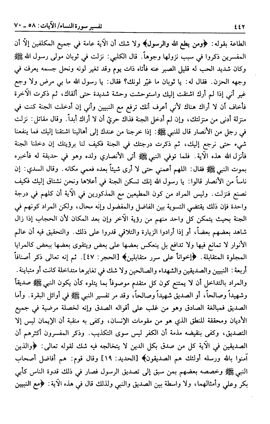 وليس المراد من كون المطيعين مع المذكورين في الآية أن كلهم في درجة واحدة فإن ذلك يقتضي التسوية بين الفاضل والمفضول وإنه محال، ولكن المراد كونهم في الجنة بحيث يتمكن كل واحد منهم من رؤية الآخر وإن بعد المكان لأن الحجاب إذا زال شاهد بعضهم بعضا، أو إذا أرادوا الزيارة والتلاقي قدروا على ذلك. والتحقيق فيه أن عالم الأنوار لا تمانع فيها ولا تدافع بل ينعكس بعضها على بعض ويتقوى بعضها ببعض كالمرايا المجلوة المتقابلة. إِخْواناً عَلى سُرُرٍ مُتَقابِلِينَ [الحجر: 47] . ثم إنه تعالى ذكر أصنافا أربعة: النبيين والصديقين والشهداء والصالحين ولا شك في تغايرها متداخلة كانت أو متباينة.
