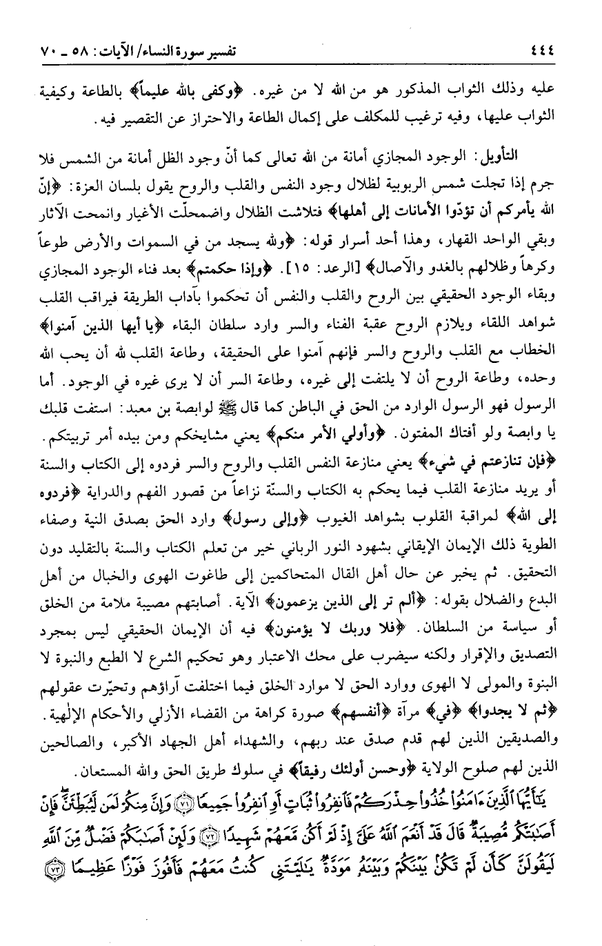 الوجود المجازي أمانة من الله تعالى كما أنّ وجود الظل أمانة من الشمس فلا جرم إذا تجلت شمس الربوبية لظلال وجود النفس والقلب والروح يقول بلسان العزة: إِنَّ اللَّهَ يَأْمُرُكُمْ أَنْ تُؤَدُّوا الْأَماناتِ إِلى أَهْلِها فتلاشت الظلال واضمحلّت الأغيار وانمحت الآثار وبقي الواحد القهار، وهذا أحد أسرار قوله: وَلِلَّهِ يَسْجُدُ مَنْ فِي السَّماواتِ وَالْأَرْضِ طَوْعاً وَكَرْهاً وَظِلالُهُمْ بِالْغُدُوِّ وَالْآصالِ [الرعد: 15] . وَإِذا حَكَمْتُمْ بعد فناء الوجود المجازي وبقاء الوجود الحقيقي بين الروح والقلب والنفس أن تحكموا بآداب الطريقة فيراقب القلب شواهد اللقاء ويلازم الروح عقبة الفناء والسر وارد سلطان البقاء يا أَيُّهَا الَّذِينَ آمَنُوا الخطاب مع القلب والروح والسر فإنهم آمنوا على الحقيقة، وطاعة القلب لله أن يحب الله وحده، وطاعة الروح أن لا يلتفت إلى غيره، وطاعة السر أن لا يرى غيره في الوجود. أما الرسول فهو الرسول الوارد من الحق في الباطن كما