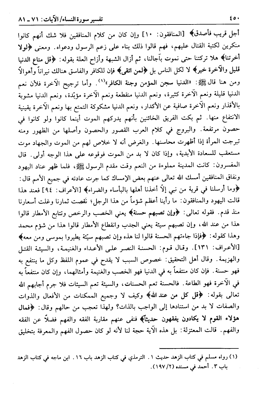[المنافقون: 10] وإن كان من كلام المنافقين فلا شك أنهم كانوا منكرين لكتبة القتال عليهم، فهم قالوا ذلك بناء على زعم الرسول ودعواه. ومعنى لَوْلا أَخَّرْتَنا هلا تركتنا حتى نموت بآجالنا، ثم أزال الشبهة وأزاح العلة بقوله: قُلْ مَتاعُ الدُّنْيا قَلِيلٌ وَالْآخِرَةُ خَيْرٌ لا لكل الناس بل لِمَنِ اتَّقى فإن للكافر والفاسق هنالك نيرانا وأهوالا ومن هنا