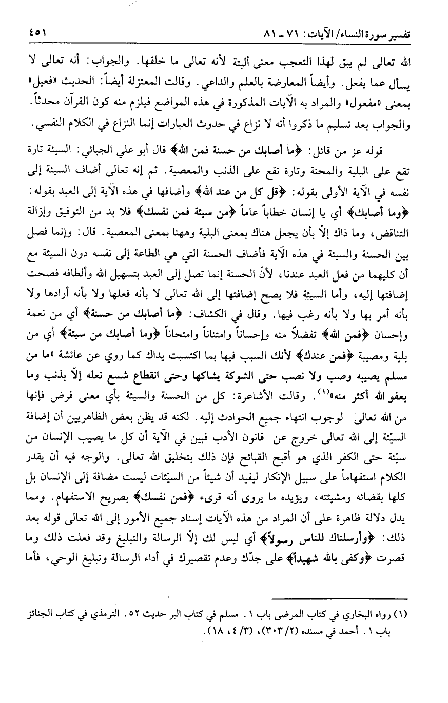 قوله عز من قائل: ما أَصابَكَ مِنْ حَسَنَةٍ فَمِنَ اللَّهِ قال أبو علي الجبائي: السيئة تارة تقع على البلية والمحنة وتارة تقع على الذنب والمعصية. ثم إنه تعالى أضاف السيئة إلى نفسه في الآية الأولى بقوله: قُلْ كُلٌّ مِنْ عِنْدِ اللَّهِ وأضافها في هذه الآية إلى العبد بقوله: