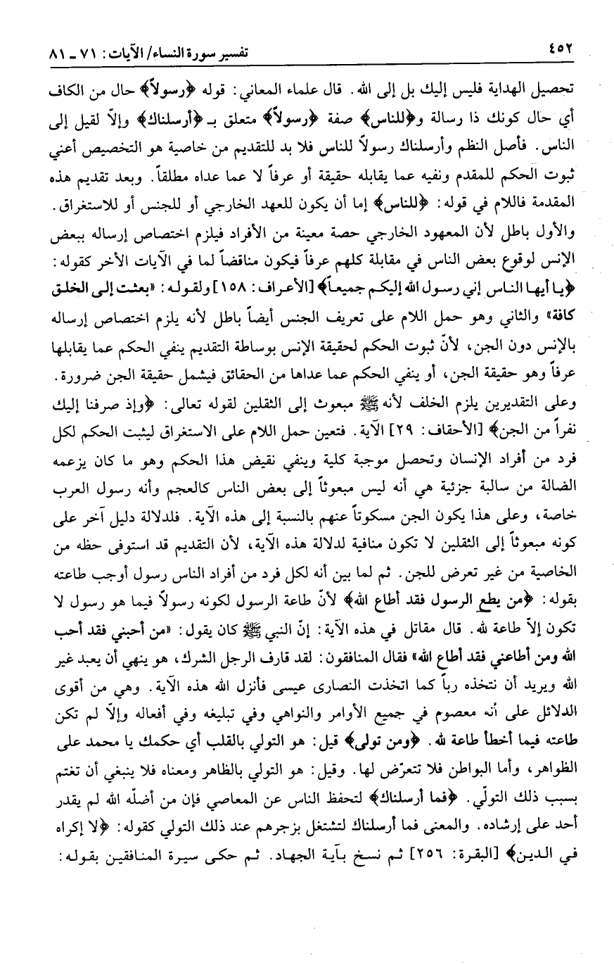 وعلى التقديرين يلزم الخلف لأنه صلى الله عليه وسلم مبعوث إلى الثقلين لقوله تعالى: وَإِذْ صَرَفْنا إِلَيْكَ نَفَراً مِنَ الْجِنِّ [الأحقاف: 29] الآية. فتعين حمل اللام على الاستغراق ليثبت الحكم لكل فرد من أفراد الإنسان وتحصل موجبة كلية وينفي نقيض هذا الحكم وهو ما كان يزعمه الضالة من سالبة جزئية هي أنه ليس مبعوثا إلى بعض الناس كالعجم وأنه رسول العرب خاصة، وعلى هذا يكون الجن مسكوتا عنهم بالنسبة إلى هذه الآية. فلدلالة دليل آخر على كونه مبعوثا إلى الثقلين لا تكون منافية لدلالة هذه الآية، لأن التقديم قد استوفى حظه من الخاصية من غير تعرض للجن. ثم لما بين أنه لكل فرد من أفراد الناس رسول أوجب طاعته بقوله: مَنْ يُطِعِ الرَّسُولَ فَقَدْ أَطاعَ اللَّهَ لأنّ طاعة الرسول لكونه رسولا فيما هو رسول لا تكون إلّا طاعة لله.