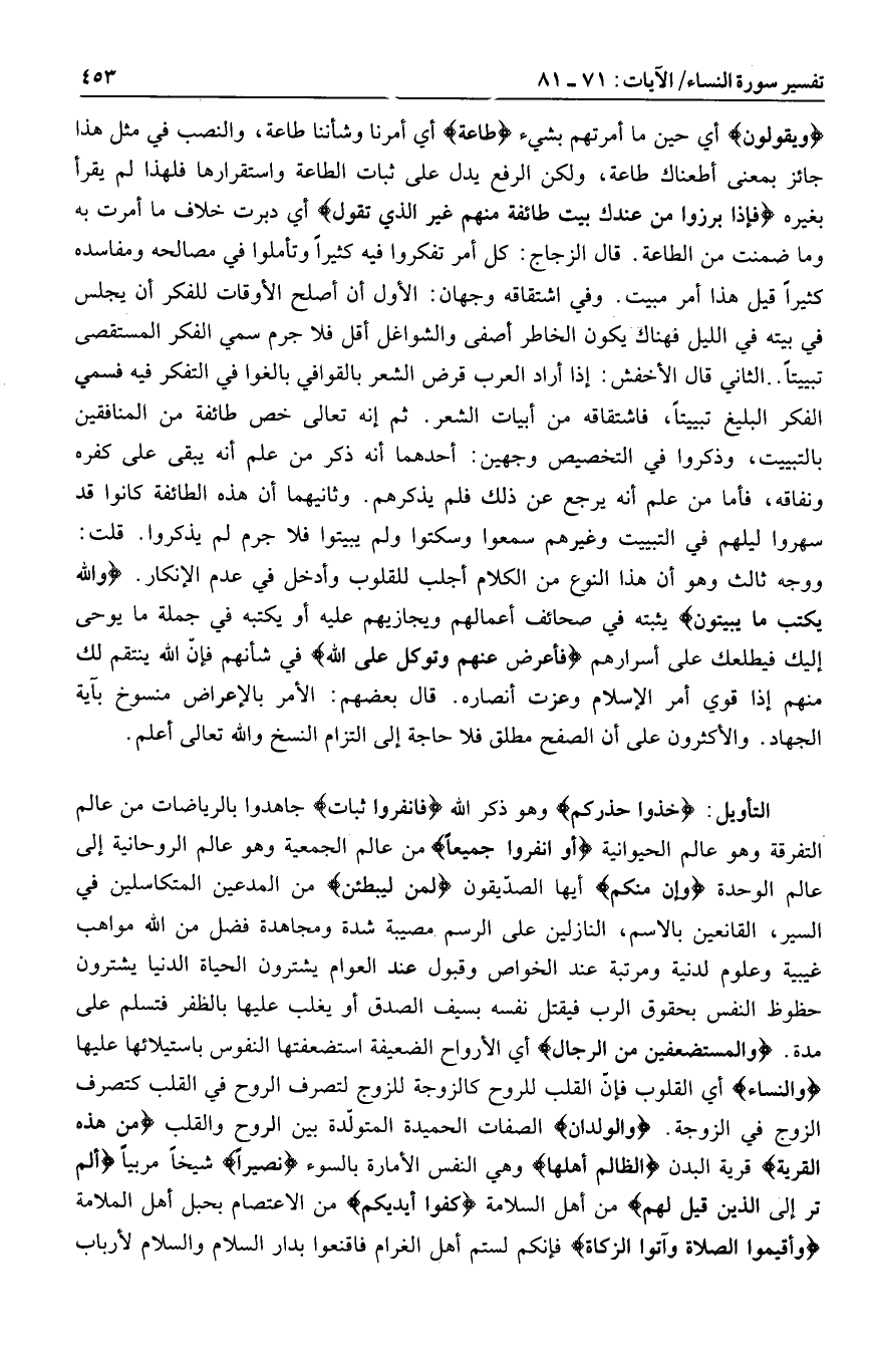 خُذُوا حِذْرَكُمْ وهو ذكر الله فَانْفِرُوا ثُباتٍ جاهدوا بالرياضات من عالم التفرقة وهو عالم الحيوانية أَوِ انْفِرُوا جَمِيعاً من عالم الجمعية وهو عالم الروحانية إلى عالم الوحدة وَإِنَّ مِنْكُمْ أيها الصدّيقون لَمَنْ لَيُبَطِّئَنَّ من المدعين المتكاسلين في السير، القانعين بالاسم، النازلين على الرسم مصيبة شدة ومجاهدة فضل من الله مواهب غيبية وعلوم لدنية ومرتبة عند الخواص وقبول عند العوام يشترون الحياة الدنيا يشترون حظوظ النفس بحقوق الرب فيقتل نفسه بسيف الصدق أو يغلب عليها بالظفر فتسلم على مدة. وَالْمُسْتَضْعَفِينَ مِنَ الرِّجالِ أي الأرواح الضعيفة استضعفتها النفوس باستيلائها عليها وَالنِّساءِ أي القلوب فإنّ القلب للروح كالزوجة للزوج لتصرف الروح في القلب كتصرف الزوج في الزوجة. وَالْوِلْدانِ الصفات الحميدة المتولّدة بين الروح والقلب مِنْ هذِهِ الْقَرْيَةِ قرية البدن الظَّالِمِ أَهْلُها وهي النفس الأمارة بالسوء نَصِيراً شيخا مربيا أَلَمْ تَرَ إِلَى الَّذِينَ قِيلَ لَهُمْ من أهل السلامة كُفُّوا أَيْدِيَكُمْ من الاعتصام بحبل أهل الملامة وَأَقِيمُوا الصَّلاةَ وَآتُوا الزَّكاةَ فإنكم لستم أهل الغرام فاقنعوا بدار السلام والسلام لأرباب