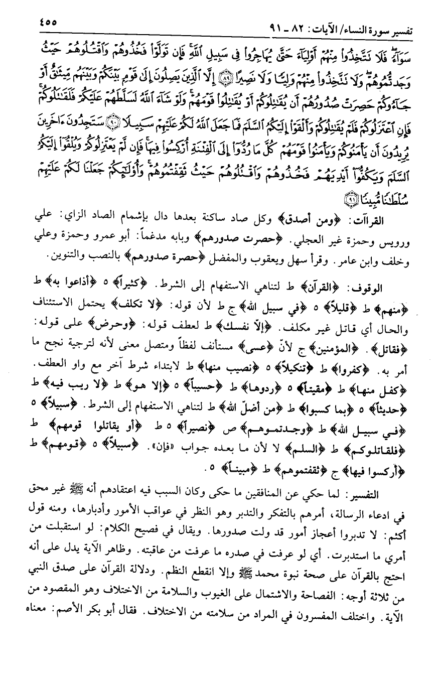 كِفْلٌ مِنْها ط مُقِيتاً هـ رُدُّوها ط حَسِيباً هـ إِلَّا هُوَ ط لا رَيْبَ فِيهِ ط حَدِيثاً هـ بِما كَسَبُوا ط مَنْ أَضَلَّ اللَّهُ ط لتناهي الاستفهام إلى الشرط. سَبِيلًا هـ فِي سَبِيلِ اللَّهِ ط وَجَدْتُمُوهُمْ ص نَصِيراً هـ ط أَوْ يُقاتِلُوا قَوْمَهُمْ ط فَلَقاتَلُوكُمْ ط السَّلَمَ لا لأن ما بعده جواب «فإن» . سَبِيلًا هـ قَوْمَهُمْ ط أُرْكِسُوا فِيها ج ثَقِفْتُمُوهُمْ ط مُبِيناً هـ.