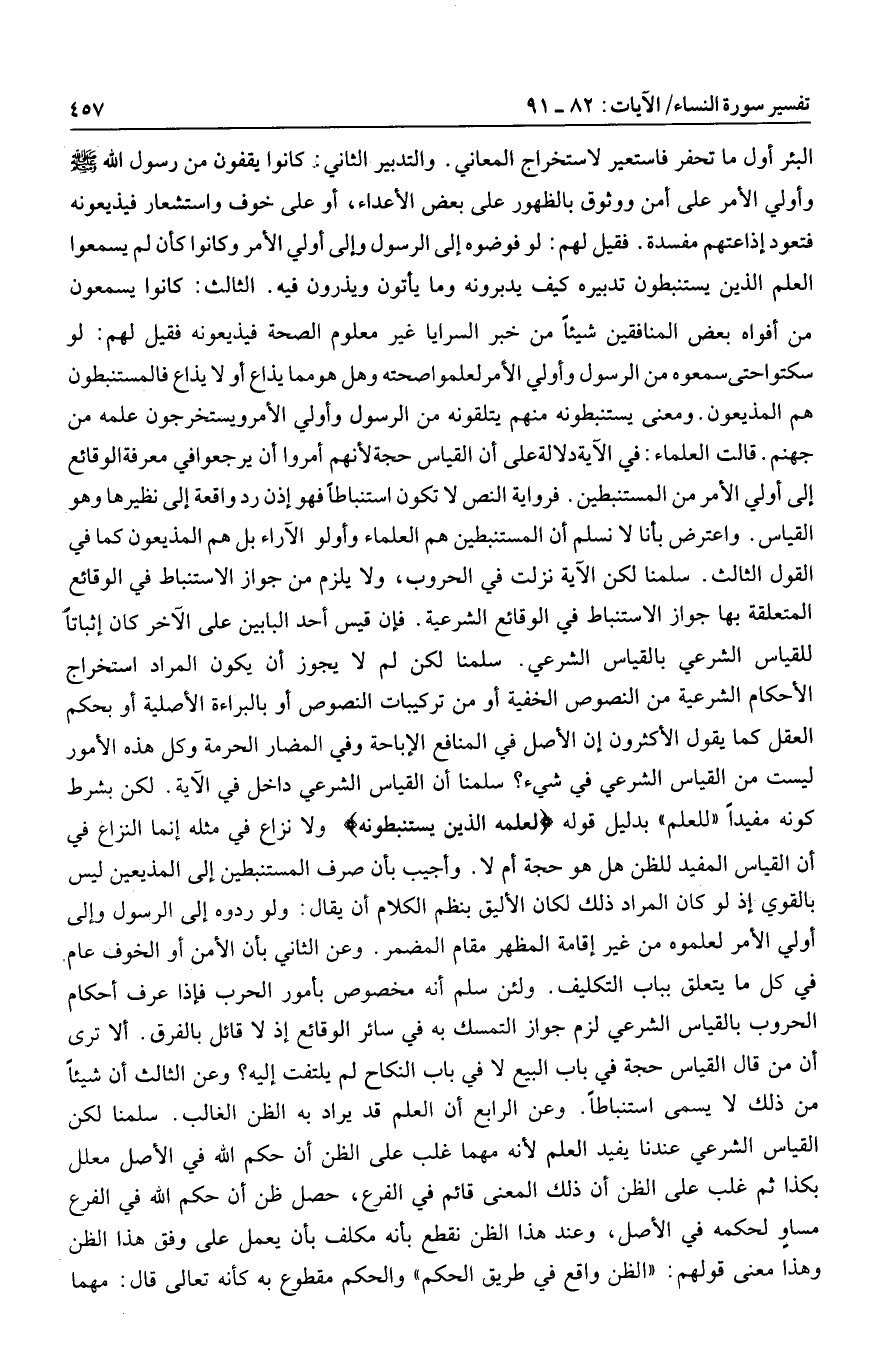 البئر أول ما تحفر فاستعير لاستخراج المعاني. والتدبير الثاني: كانوا يقفون من رسول الله صلى الله عليه وسلم وأولي الأمر على أمن ووثوق بالظهور على بعض الأعداء، أو على خوف واستشعار فيذيعونه فتعود إذاعتهم مفسدة. فقيل لهم: لو فوضوه إلى الرسول وإلى أولي الأمر وكانوا كأن لم يسمعوا العلم الذين يستنبطون تدبيره كيف يدبرونه وما يأتون ويذرون فيه. الثالث: كانوا يسمعون من أفواه بعض المنافقين شيئا من خبر السرايا غير معلوم الصحة فيذيعونه فقيل لهم: لو سكتوا حتى سمعوه من الرسول وأولي الأمر لعلموا صحته وهل هو مما يذاع أو لا يذاع فالمستنبطون هم المذيعون. ومعنى يستنبطونه منهم يتلقونه من الرسول وأولي الأمر ويستخرجون علمه من جهنم. قالت العلماء: في الآية دلالة على أن القياس حجة لأنهم أمروا أن يرجعوا في معرفة الوقائع إلى أولي الأمر من المستنبطين. فرواية النص لا تكون استنباطا فهو إذن رد واقعة إلى نظيرها وهو القياس. واعترض بأنا لا نسلم أن المستنبطين هم العلماء وأولو الآراء بل هم المذيعون كما في القول الثالث. سلمنا لكن الآية نزلت في الحروب، ولا يلزم من جواز الاستنباط في الوقائع المتعلقة بها جواز الاستنباط في الوقائع الشرعية. فإن قيس أحد البابين على الآخر كان إثباتا للقياس الشرعي بالقياس الشرعي. سلمنا لكن لم لا يجوز أن يكون المراد استخراج الأحكام الشرعية من النصوص الخفية أو من تركيبات النصوص أو بالبراءة الأصلية أو بحكم العقل كما يقول الأكثرون إن الأصل في المنافع الإباحة وفي المضار الحرمة وكل هذه الأمور ليست من القياس الشرعي في شيء؟ سلمنا أن القياس الشرعي داخل في الآية. لكن بشرط كونه مفيدا «للعلم» بدليل قوله لَعَلِمَهُ الَّذِينَ يَسْتَنْبِطُونَهُ ولا نزاع في مثله إنما النزاع في أن القياس المفيد للظن هل هو حجة أم لا. وأجيب بأن صرف المستنبطين إلى المذيعين ليس بالقوي إذ لو كان المراد ذلك لكان الأليق بنظم الكلام أن يقال: ولو ردوه إلى الرسول وإلى أولي الأمر لعلموه من غير إقامة المظهر مقام