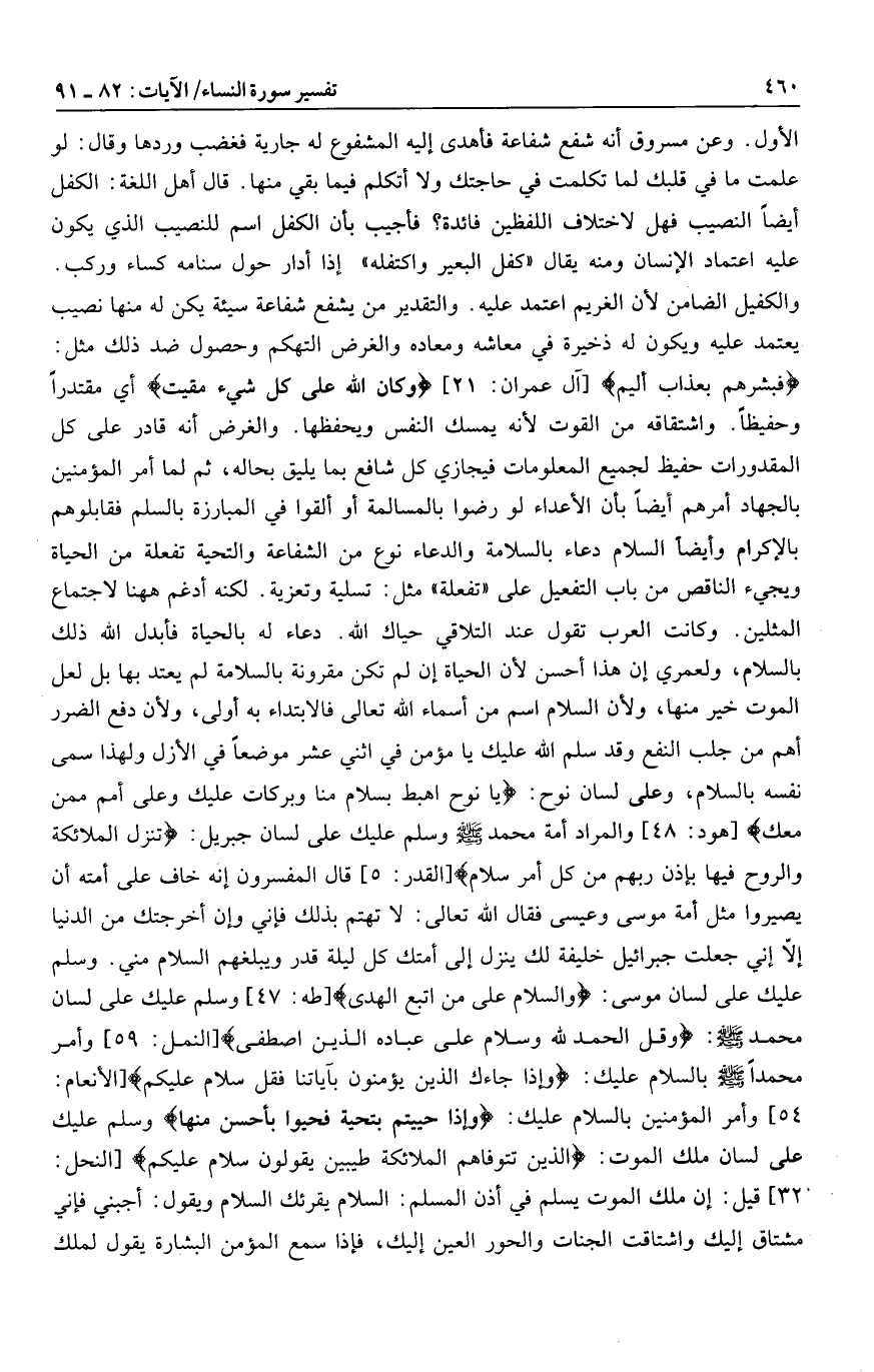 فَبَشِّرْهُمْ بِعَذابٍ أَلِيمٍ [آل عمران: 21] وَكانَ اللَّهُ عَلى كُلِّ شَيْءٍ مُقِيتاً أي مقتدرا وحفيظا. واشتقاقه من القوت لأنه يمسك النفس ويحفظها. والغرض أنه قادر على كل المقدورات حفيظ لجميع المعلومات فيجازي كل شافع بما يليق بحاله، ثم لما أمر المؤمنين بالجهاد أمرهم أيضا بأن الأعداء لو رضوا بالمسالمة أو ألقوا في المبارزة بالسلم فقابلوهم بالإكرام وأيضا السلام دعاء بالسلامة والدعاء نوع من الشفاعة والتحية تفعلة من الحياة ويجيء الناقص من باب التفعيل على «تفعلة» مثل: تسلية وتعزية. لكنه أدغم هاهنا لاجتماع المثلين. وكانت العرب تقول عند التلاقي حياك الله. دعاء له بالحياة فأبدل الله ذلك بالسلام، ولعمري إن هذا أحسن لأن الحياة إن لم تكن مقرونة بالسلامة لم يعتد بها بل لعل الموت خير منها، ولأن السلام اسم من أسماء الله تعالى فالابتداء به أولى، ولأن دفع الضرر أهم من جلب النفع وقد سلم الله عليك يا مؤمن في اثني عشر موضعا في الأزل ولهذا سمى نفسه بالسلام، وعلى لسان نوح: يا نُوحُ اهْبِطْ بِسَلامٍ مِنَّا وَبَرَكاتٍ عَلَيْكَ وَعَلى أُمَمٍ مِمَّنْ مَعَكَ [هود: 48] والمراد أمة محمد صلى الله عليه وسلم وسلم عليك على لسان جبريل: تَنَزَّلُ الْمَلائِكَةُ وَالرُّوحُ فِيها بِإِذْنِ رَبِّهِمْ مِنْ كُلِّ أَمْرٍ سَلامٌ [القدر: 5] قال المفسرون إنه خاف على أمته أن يصيروا مثل أمة موسى وعيسى فقال الله تعالى: لا تهتم بذلك فإني وإن أخرجتك من الدنيا إلّا إني جعلت جبرائيل خليفة لك ينزل إلى أمتك كل ليلة قدر ويبلغهم السلام مني. وسلم عليك على لسان موسى: وَالسَّلامُ عَلى مَنِ اتَّبَعَ الْهُدى [طه: 47] وسلم عليك على لسان محمد صلى الله عليه وسلم: قُلِ الْحَمْدُ لِلَّهِ وَسَلامٌ عَلى عِبادِهِ الَّذِينَ اصْطَفى [النمل: 59] وأمر محمدا صلى الله عليه وسلم بالسلام عليك: وَإِذا جاءَكَ الَّذِينَ يُؤْمِنُونَ بِآياتِنا فَقُلْ سَلامٌ عَلَيْكُمْ [الأنعام: