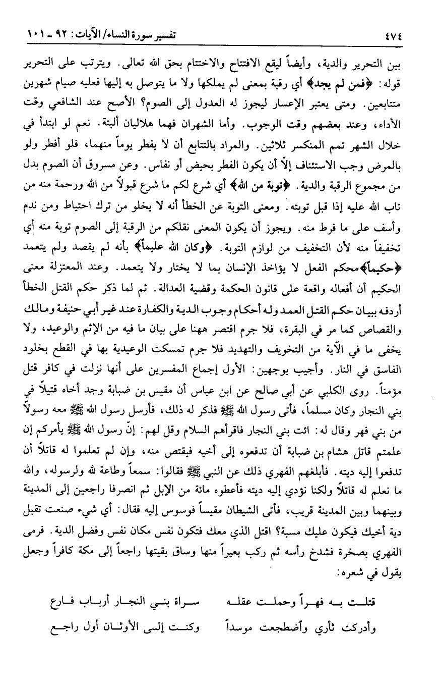 لوازم التوبة. وَكانَ اللَّهُ عَلِيماً بأنه لم يقصد ولم يتعمد حَكِيماً محكم الفعل لا يؤاخذ الإنسان بما لا يختار ولا يتعمد. وعند المعتزلة معنى الحكيم أن أفعاله واقعة على قانون الحكمة وقضية العدالة. ثم لما ذكر حكم القتل الخطأ أردفه ببيان حكم القتل العمد وله أحكام وجوب الدية والكفارة عند غير أبي حنيفة ومالك والقصاص كما مر في البقرة، فلا جرم اقتصر هاهنا على بيان ما فيه من الإثم والوعيد، ولا يخفى ما في الآية من التخويف والتهديد فلا جرم تمسكت الوعيدية بها في القطع بخلود الفاسق في النار. وأجيب بوجهين: الأول إجماع المفسرين على أنها نزلت في كافر قتل مؤمنا.