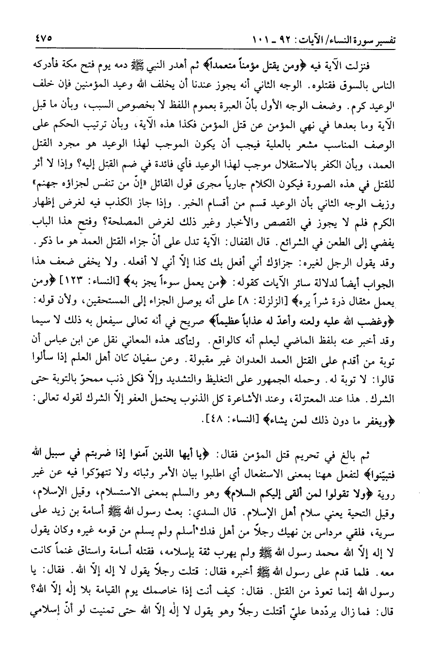 وَمَنْ يَقْتُلْ مُؤْمِناً مُتَعَمِّداً ثم أهدر النبي صلى الله عليه وسلم دمه يوم فتح مكة فأدركه الناس بالسوق فقتلوه. الوجه الثاني أنه يجوز عندنا أن يخلف الله وعيد المؤمنين فإن خلف الوعيد كرم. وضعف الوجه الأول بأنّ العبرة بعموم اللفظ لا بخصوص السبب، وبأن ما قبل الآية وما بعدها في نهي المؤمن عن قتل المؤمن فكذا هذه الآية، وبأن ترتيب الحكم على الوصف المناسب مشعر بالعلية فيجب أن يكون الموجب لهذا الوعيد هو مجرد القتل العمد، وبأن الكفر بالاستقلال موجب لهذا الوعيد فأي فائدة في ضم القتل إليه؟ وإذا لا أثر للقتل في هذه الصورة فيكون الكلام جاريا مجرى قول القائل «إنّ من تنفس لجزاؤه جهنم» وزيف الوجه الثاني بأن الوعيد قسم من أقسام الخبر. وإذا جاز الكذب فيه لغرض إظهار الكرم فلم لا يجوز في القصص والأخبار وغير ذلك لغرض المصلحة؟ وفتح هذا الباب يفضي إلى الطعن في الشرائع. قال القفال: الآية تدل على أنّ جزاء القتل العمد هو ما ذكر.