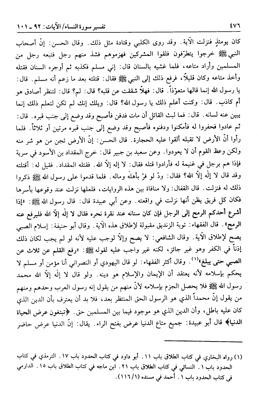 وعن سعيد بن جبير قال: خرج المقداد بن الأسود في سرية فإذا هم برجل في غنيمة له فأرادوا قتله فقال: لا إله إلّا الله. فقتله المقداد. فقيل له: أقتلته وقد قال لا إله إلّا الله؟ فقال: ودّ لو فرّ بأهله وماله. فلما قدموا على رسول الله صلى الله عليه وسلم ذكروا ذلك له فنزلت.