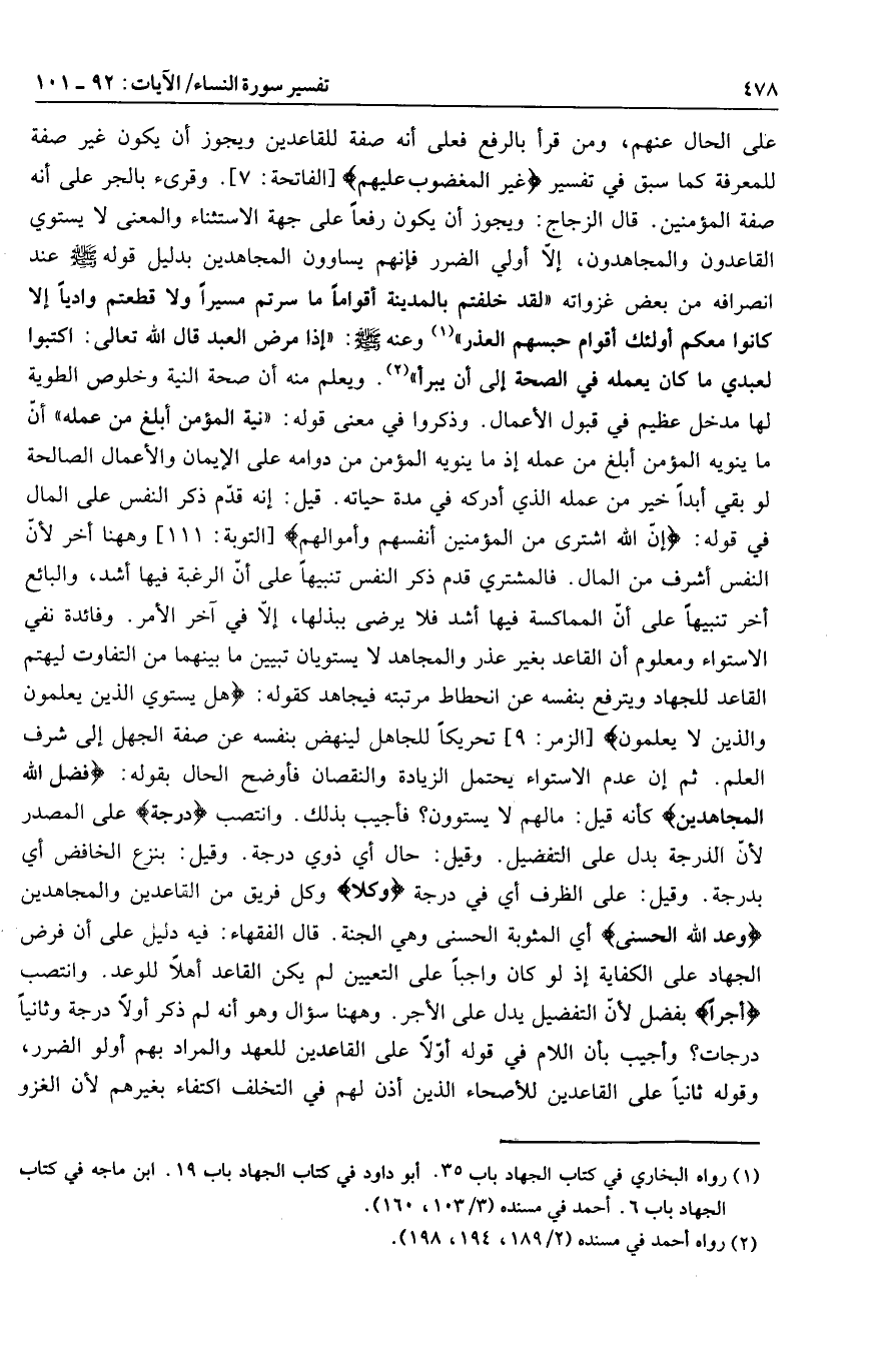 أنّ ما ينويه المؤمن أبلغ من عمله إذ ما ينويه المؤمن من دوامه على الإيمان والأعمال الصالحة لو بقي أبدا خير من عمله الذي أدركه في مدة حياته. قيل: إنه قدّم ذكر النفس على المال في قوله: إِنَّ اللَّهَ اشْتَرى مِنَ الْمُؤْمِنِينَ أَنْفُسَهُمْ وَأَمْوالَهُمْ [التوبة: 111] وهاهنا أخر لأنّ النفس أشرف من المال. فالمشتري قدم ذكر النفس تنبيها على أنّ الرغبة فيها أشد، والبائع أخر تنبيها على أنّ المماكسة فيها أشد فلا يرضى ببذلها، إلّا في آخر الأمر. وفائدة نفي الاستواء ومعلوم أن القاعد بغير عذر والمجاهد لا يستويان تبيين ما بينهما من التفاوت ليهتم القاعد للجهاد ويترفع بنفسه عن انحطاط مرتبته فيجاهد كقوله: هَلْ يَسْتَوِي الَّذِينَ يَعْلَمُونَ وَالَّذِينَ لا يَعْلَمُونَ [الزمر: 9] تحريكا للجاهل لينهض بنفسه عن صفة الجهل إلى شرف العلم. ثم إن عدم الاستواء يحتمل الزيادة والنقصان فأوضح الحال بقوله: فَضَّلَ اللَّهُ الْمُجاهِدِينَ كأنه قيل: مالهم لا يستوون؟ فأجيب بذلك. وانتصب دَرَجَةً على المصدر لأنّ الدرجة بدل على التفضيل. وقيل: حال أي ذوي درجة. وقيل: بنزع الخافض أي بدرجة. وقيل: على الظرف أي في درجة وَكُلًّا وكل فريق من القاعدين والمجاهدين وَعَدَ اللَّهُ الْحُسْنى أي المثوبة الحسنى وهي الجنة. قال الفقهاء: فيه دليل على أن فرض الجهاد على الكفاية إذ لو كان واجبا على التعيين لم يكن القاعد أهلا للوعد. وانتصب أَجْراً بفضل لأنّ التفضيل يدل على الأجر. وهاهنا سؤال وهو أنه لم ذكر أولا درجة وثانيا درجات؟ وأجيب بأن اللام في قوله أوّلا على القاعدين للعهد والمراد بهم أولو الضرر، وقوله ثانيا على القاعدين للأصحاء الذين أذن لهم في التخلف اكتفاء بغيرهم لأن الغزو