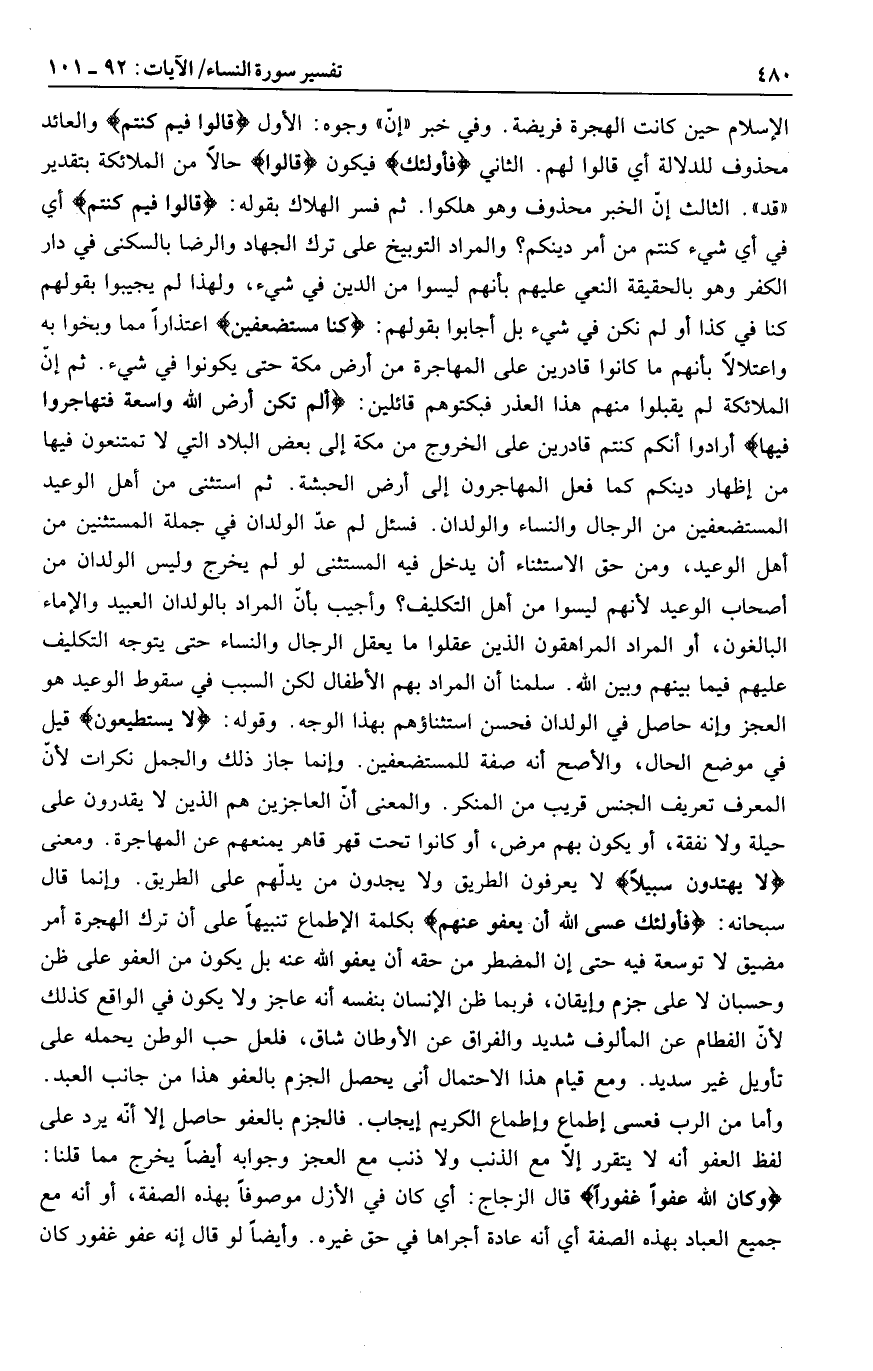 الإسلام حين كانت الهجرة فريضة. وفي خبر «إنّ» وجوه: الأول قالُوا فِيمَ كُنْتُمْ والعائد محذوف للدلالة أي قالوا لهم. الثاني فَأُولئِكَ فيكون قالُوا حالا من الملائكة بتقدير «قد» . الثالث إنّ الخبر محذوف وهو هلكوا. ثم فسر الهلاك بقوله: قالُوا فِيمَ كُنْتُمْ أي في أي شيء كنتم من أمر دينكم؟ والمراد التوبيخ على ترك الجهاد والرضا بالسكنى في دار الكفر وهو بالحقيقة النعي عليهم بأنهم ليسوا من الدين في شيء، ولهذا لم يجيبوا بقولهم كنا في كذا أو لم نكن في شيء بل أجابوا بقولهم: كُنَّا مُسْتَضْعَفِينَ اعتذارا مما وبخوا به واعتلالا بأنهم ما كانوا قادرين على المهاجرة من أرض مكة حتى يكونوا في شيء. ثم إنّ الملائكة لم يقبلوا منهم هذا العذر فبكتوهم قائلين: أَلَمْ تَكُنْ أَرْضُ اللَّهِ واسِعَةً فَتُهاجِرُوا فِيها أرادوا أنكم كنتم قادرين على الخروج من مكة إلى بعض البلاد التي لا تمتنعون فيها من إظهار دينكم كما فعل المهاجرون إلى أرض الحبشة. ثم استثنى من أهل الوعيد المستضعفين من الرجال والنساء والولدان. فسئل لم عدّ الولدان في جملة المستثنين من أهل الوعيد، ومن حق الاستثناء أن يدخل فيه المستثنى لو لم يخرج وليس الولدان من أصحاب الوعيد لأنهم ليسوا من أهل التكليف؟ وأجيب بأنّ المراد بالولدان العبيد والإماء البالغون، أو المراد المراهقون الذين عقلوا ما يعقل الرجال والنساء حتى يتوجه التكليف عليهم فيما بينهم وبين الله. سلمنا أن المراد بهم الأطفال لكن السبب في سقوط الوعيد هو العجز وإنه حاصل في الولدان فحسن استثناؤهم بهذا الوجه. وقوله: لا يَسْتَطِيعُونَ قيل في موضع الحال، والأصح أنه صفة للمستضعفين. وإنما جاز ذلك والجمل نكرات لأنّ المعرف تعريف الجنس قريب من المنكر. والمعنى أنّ العاجزين هم الذين لا يقدرون على حيلة ولا نفقة، أو يكون بهم مرض، أو كانوا تحت قهر قاهر يمنعهم عن المهاجرة. ومعنى لا يَهْتَدُونَ سَبِيلًا لا يعرفون الطريق ولا يجدون من يدلّهم على الطريق. وإنما قال سبحانه: فَأُولئِكَ عَسَى اللَّهُ أَنْ يَعْفُوَ عَنْهُمْ بكلمة الإطماع تنبيها على أن ترك الهجرة أمر مضيق لا توسعة فيه حتى إن المضطر من حقه أن يعفو الله عنه بل يكون من العفو على ظن وحسبان لا على جزم وإيقان، فربما ظن الإنسان بنفسه أنه عاجز ولا يكون في الواقع كذلك لأنّ الفطام عن المألوف شديد والفراق عن الأوطان شاق، فلعل حب الوطن يحمله على تأويل غير سديد. ومع قيام هذا الاحتمال أنى يحصل الجزم بالعفو هذا من جانب العبد.