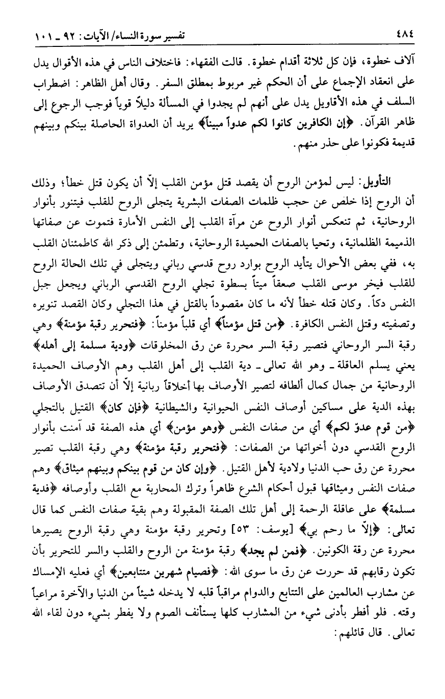 ليس لمؤمن الروح أن يقصد قتل مؤمن القلب إلّا أن يكون قتل خطأ وذلك أن الروح إذا خلص عن حجب ظلمات الصفات البشرية يتجلى الروح للقلب فيتنور بأنوار الروحانية، ثم تنعكس أنوار الروح عن مرآة القلب إلى النفس الأمارة فتموت عن صفاتها الذميمة الظلمانية، وتحيا بالصفات الحميدة الروحانية، وتطمئن إلى ذكر الله كاطمئنان القلب به، ففي بعض الأحوال يتأيد الروح بوارد روح قدسي رباني ويتجلى في تلك الحالة الروح للقلب فيخر موسى القلب صعقا ميتا بسطوة تجلي الروح القدسي الرباني ويجعل جبل النفس دكا. وكان قتله خطأ لأنه ما كان مقصودا بالقتل في هذا التجلي وكان القصد تنويره وتصفيته وقتل النفس الكافرة. مَنْ قَتَلَ مُؤْمِناً أي قلبا مؤمنا: فَتَحْرِيرُ رَقَبَةٍ مُؤْمِنَةٍ وهي رقبة السر الروحاني فتصير رقبة السر محررة عن رق المخلوقات وَدِيَةٌ مُسَلَّمَةٌ إِلى أَهْلِهِ يعني يسلم العاقلة- وهو الله تعالى- دية القلب إلى أهل القلب وهم الأوصاف الحميدة الروحانية من جمال كمال ألطافه لتصير الأوصاف بها أخلاقا ربانية إلّا أن تتصدق الأوصاف بهذه الدية على مساكين أوصاف النفس الحيوانية والشيطانية فَإِنْ كانَ القتيل بالتجلي مِنْ قَوْمٍ عَدُوٍّ لَكُمْ أي من صفات النفس وَهُوَ مُؤْمِنٌ أي هذه الصفة قد آمنت بأنوار الروح القدسي دون أخواتها من الصفات: فَتَحْرِيرُ رَقَبَةٍ مُؤْمِنَةٍ وهي رقبة القلب تصير محررة عن رق حب الدنيا ولا دية لأهل القتيل. وَإِنْ كانَ مِنْ قَوْمٍ بَيْنَكُمْ وَبَيْنَهُمْ مِيثاقٌ وهم صفات النفس وميثاقها قبول أحكام الشرع ظاهرا وترك المحاربة مع القلب وأوصافه فَدِيَةٌ مُسَلَّمَةٌ على عاقلة الرحمة إلى أهل تلك الصفة المقبولة وهم بقية صفات النفس كما قال تعالى: إِلَّا ما رَحِمَ رَبِّي [يوسف: 53] وتحرير رقبة مؤمنة وهي رقبة الروح يصيرها محررة عن رقة الكونين. فَمَنْ لَمْ يَجِدْ رقبة مؤمنة من الروح والقلب والسر للتحرير بأن تكون رقابهم قد حررت عن رق ما سوى الله: فَصِيامُ شَهْرَيْنِ مُتَتابِعَيْنِ أي فعليه الإمساك عن مشارب العالمين على التتابع والدوام مراقبا قلبه لا يدخله شيئا من الدنيا والآخرة مراعيا وقته. فلو أفطر بأدنى شيء من المشارب كلها يستأنف الصوم ولا يفطر بشيء دون لقاء الله تعالى. قال قائلهم: