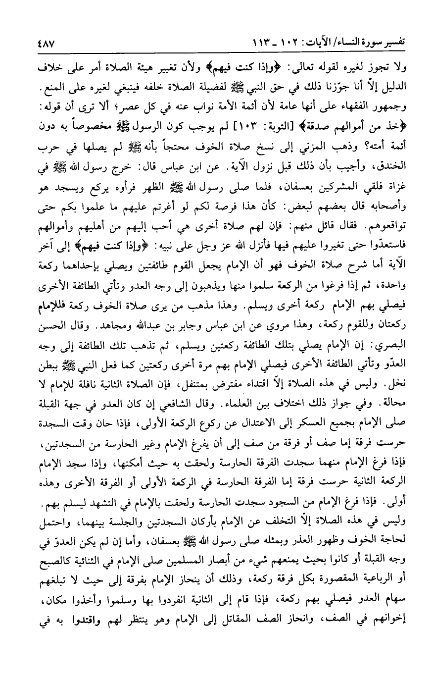 خُذْ مِنْ أَمْوالِهِمْ صَدَقَةً [التوبة: 103] لم يوجب كون الرسول صلى الله عليه وسلم مخصوصا به دون أئمة أمته؟ وذهب المزني إلى نسخ صلاة الخوف محتجا بأنه صلى الله عليه وسلم لم يصلها في حرب الخندق، وأجيب بأن ذلك قبل نزول الآية.