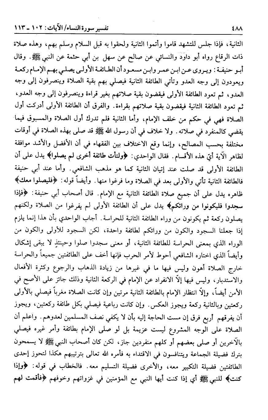 وقال أبو حنيفة: ويروى عن ابن عمر وابن مسعود أن الطائفة الأولى يصلي بهم الإمام ركعة ويعودون إلى وجه العدو وتأتي الطائفة الثانية فيصلي بهم بقية الصلاة وينصرفون إلى وجه العدو، ثم تعود الطائفة الأولى فيقضون بقية صلاتهم بغير قراءة وينصرفون إلى وجه العدو، ثم تعود الطائفة الثانية فيقضون بقية صلاتهم بقراءة. والفرق أن الطائفة الأولى أدركت أول الصلاة فهي في حكم من خلف الإمام، وأما الثانية فلم تدرك أول الصلاة والمسبوق فيما يقضي كالمنفرد في صلاته. ولا خلاف في أن رسول الله صلى الله عليه وسلم قد صلى بهذه الصلاة في أوقات مختلفة بحسب المصالح، وإنما وقع الاختلاف بين الفقهاء في أن الأفضل والأشد موافقة لظاهر الآية أيّ هذه الأقسام. فقال الواحدي: وَلْتَأْتِ طائِفَةٌ أُخْرى لَمْ يُصَلُّوا يدل على أن الطائفة الأولى قد صلت عند إتيان الثانية كما هو مذهب الشافعي. وأما عند أبي حنيفة فالطائفة الثانية تأتي والأولى بعد في الصلاة وما فرغوا منها. وأيضا قوله: فَلْيُصَلُّوا مَعَكَ ظاهره يدل على أن جميع صلاة الطائفة الثانية مع الإمام. قال أصحاب أبي حنيفة: فَإِذا سَجَدُوا فَلْيَكُونُوا مِنْ وَرائِكُمْ يدل على أن الطائفة الأولى لم يفرغوا من الصلاة ولكنهم يصلون ركعة ثم يكونون من وراء الطائفة الثانية للحراسة. أجاب الواحدي بأن هذا إنما يلزم إذا جعلنا السجود والكون من ورائكم لطائفة واحدة، لكن السجود للأولى والكون من الوراء الذي بمعنى الحراسة للطائفة الثانية، أو معنى سجدوا صلوا وحينئذ لا يبقى إشكال وأيضا الذي اختاره الشافعي أحوط لأمر الحرب فإنها أخف على الطائفتين جميعا والحراسة خارج الصلاة أهون وليس فيها ما في غيرها من زيادة الذهاب والرجوع وكثرة الأفعال والاستدبار، وليس فيها إلّا الانفراد عن الإمام في الركعة الثانية وذلك جائز على الأصح في الأمن أيضا، وإلّا انتظار الإمام بالطائفة الثانية مرتين وإن كانت الصلاة مغربا فيصلي بالأولى ركعتين وبالثانية ركعة ويجوز العكس. وإن كانت رباعية فيصلي بكل طائفة ركعتين، ويجوز أن يفرقهم أربع فرق إن مست الحاجة إليه بأن لا يكفي نصف المسلمين لعدوهم. واعلم أن الصلاة على الوجه المشروع ليست عزيمة بل لو صلى الإمام بطائفة وأمر غيره فيصلي بالآخرين أو صلى بعضهم أو كلهم منفردين جاز، لكن كان أصحاب النبي صلى الله عليه وسلم لا يسمحون بترك فضيلة الجماعة ويتنافسون في الاقتداء به فأمره الله تعالى بترتيبهم هكذا لتحوز إحدى الطائفتين فضيلة التكبير معه، والأخرى فضيلة التسليم معه. فالخطاب في قوله: وَإِذا كُنْتَ للنبي صلى الله عليه وسلم أي إذا كنت أيها النبي مع المؤمنين في غزواتهم وخوفهم فَأَقَمْتَ لَهُمُ