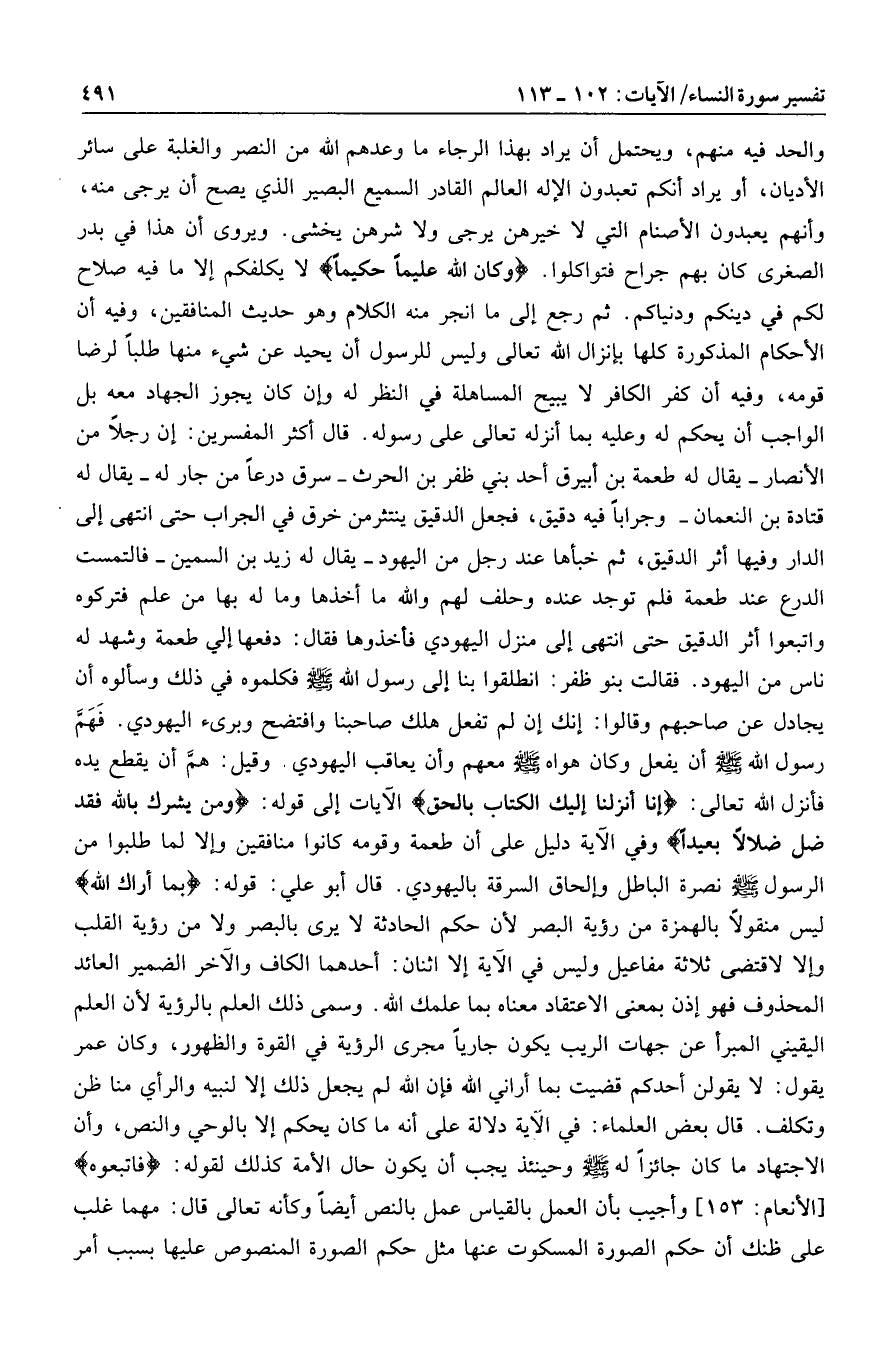 وقيل: همَّ أن يقطع يده فأنزل الله تعالى: إِنَّا أَنْزَلْنا إِلَيْكَ الْكِتابَ بِالْحَقِّ الآيات إلى قوله: وَمَنْ يُشْرِكْ بِاللَّهِ فَقَدْ ضَلَّ ضَلالًا بَعِيداً وفي الآية دليل على أن طعمة وقومه كانوا منافقين وإلا لما طلبوا من الرسول صلى الله عليه وسلم نصرة الباطل وإلحاق السرقة باليهودي. قال أبو علي: قوله: بِما أَراكَ اللَّهُ ليس منقولا بالهمزة من رؤية البصر لأن حكم الحادثة لا يرى بالبصر ولا من رؤية القلب وإلا لاقتضى ثلاثة مفاعيل وليس في الآية إلا اثنان: أحدهما الكاف والآخر الضمير العائد المحذوف فهو إذن بمعنى الاعتقاد معناه بما علمك الله. وسمى ذلك العلم بالرؤية لأن العلم اليقيني المبرأ عن جهات الريب يكون جاريا مجرى الرؤية في القوة والظهور، وكان عمر يقول: لا يقولن أحدكم قضيت بما أراني الله فإن الله لم يجعل ذلك إلا لنبيه والرأي منا ظن وتكلف. قال بعض العلماء: في الآية دلالة على أنه ما كان يحكم إلا بالوحي والنص، وأن الاجتهاد ما كان جائزا له صلى الله عليه وسلم وحينئذ يجب أن يكون حال الأمة كذلك لقوله: فَاتَّبِعُوهُ [الأنعام: 153] وأجيب بأن العمل بالقياس عمل بالنص أيضا وكأنه تعالى قال: مهما غلب على ظنك أن حكم الصورة المسكوت عنها مثل حكم الصورة المنصوص عليها بسبب أمر