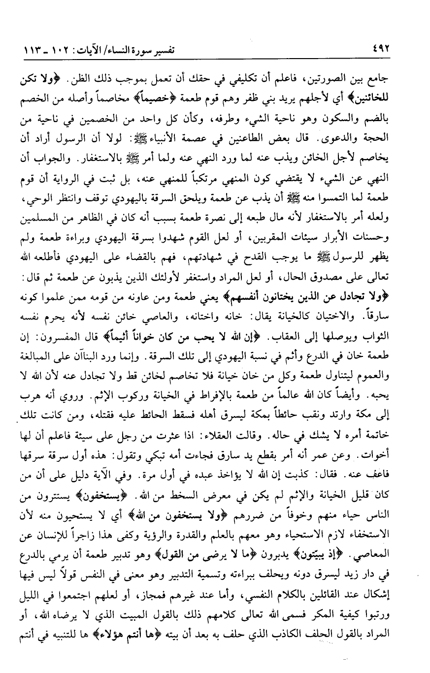 جامع بين الصورتين، فاعلم أن تكليفي في حقك أن تعمل بموجب ذلك الظن. وَلا تَكُنْ لِلْخائِنِينَ أي لأجلهم يريد بني ظفر وهم قوم طعمة خَصِيماً مخاصما وأصله من الخصم بالضم والسكون وهو ناحية الشيء وطرفه، وكأن كل واحد من الخصمين في ناحية من الحجة والدعوى. قال بعض الطاعنين في عصمة الأنبياء صلى الله عليه وسلم: لولا أن الرسول أراد أن يخاصم لأجل الخائن ويذب عنه لما ورد النهي عنه ولما أمر صلى الله عليه وسلم بالاستغفار. والجواب أن النهي عن الشيء لا يقتضي كون المنهي مرتكبا للمنهي عنه، بل ثبت في الرواية أن قوم طعمة لما التمسوا منه صلى الله عليه وسلم أن يذب عن طعمة ويلحق السرقة باليهودي توقف وانتظر الوحي، ولعله أمر بالاستغفار لأنه مال طبعه إلى نصرة طعمة بسبب أنه كان في الظاهر من المسلمين وحسنات الأبرار سيئات المقربين، أو لعل القوم شهدوا بسرقة اليهودي وبراءة طعمة ولم يظهر للرسول صلى الله عليه وسلم ما يوجب القدح في شهادتهم، فهم بالقضاء على اليهودي فأطلعه الله تعالى على مصدوق الحال، أو لعل المراد واستغفر لأولئك الذين يذبون عن طعمة ثم قال: