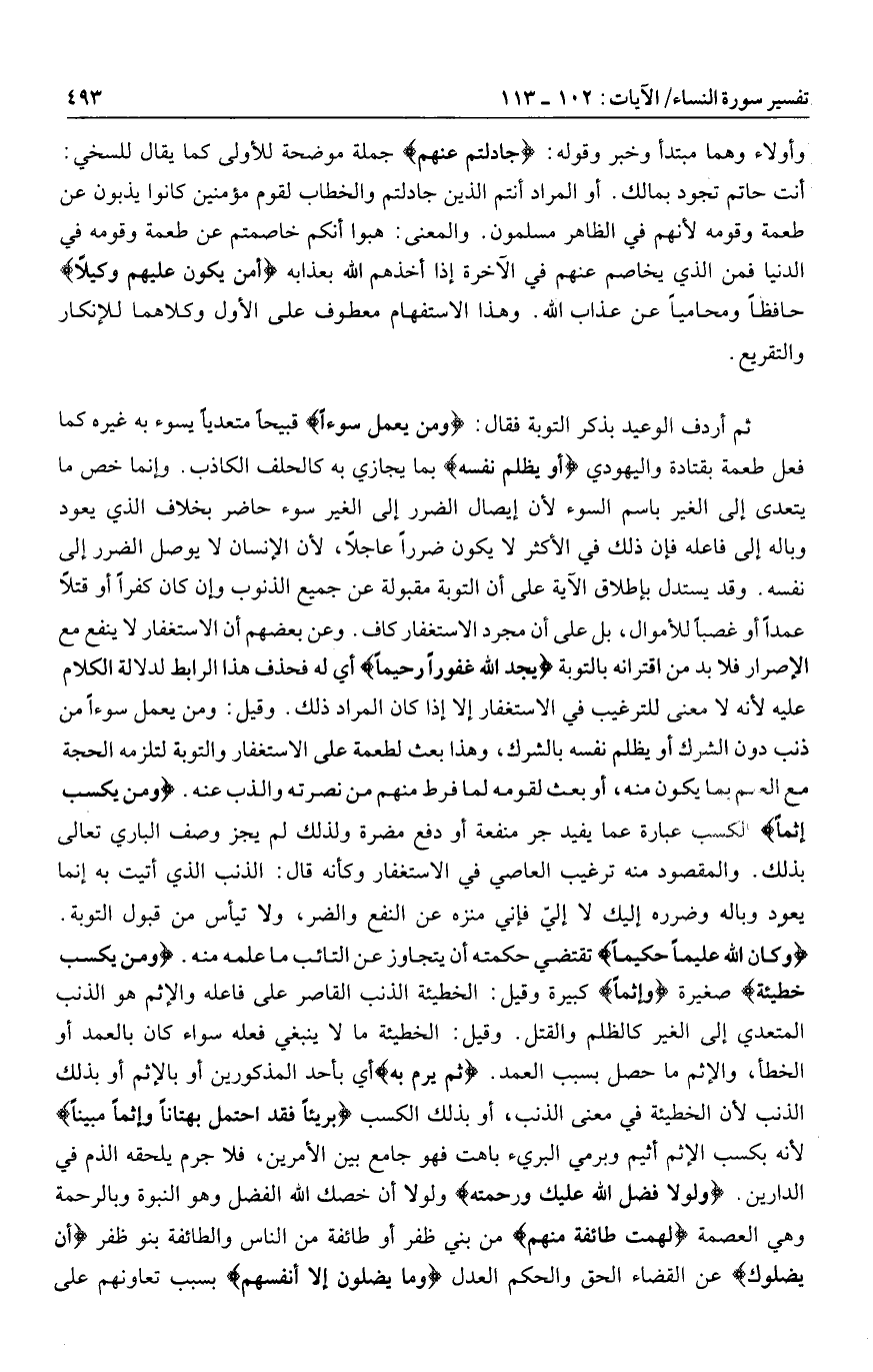 أي له فحذف هذا الرابط لدلالة الكلام عليه لأنه لا معنى للترغيب في الاستغفار إلا إذا كان المراد ذلك. وقيل: ومن يعمل سوءا من ذنب دون الشرك أو يظلم نفسه بالشرك، وهذا بعث لطعمة على الاستغفار والتوبة لتلزمه الحجة مع العلم بما يكون منه، أو بعث لقومه لما فرط منهم من نصرته والذب عنه. وَمَنْ يَكْسِبْ إِثْماً