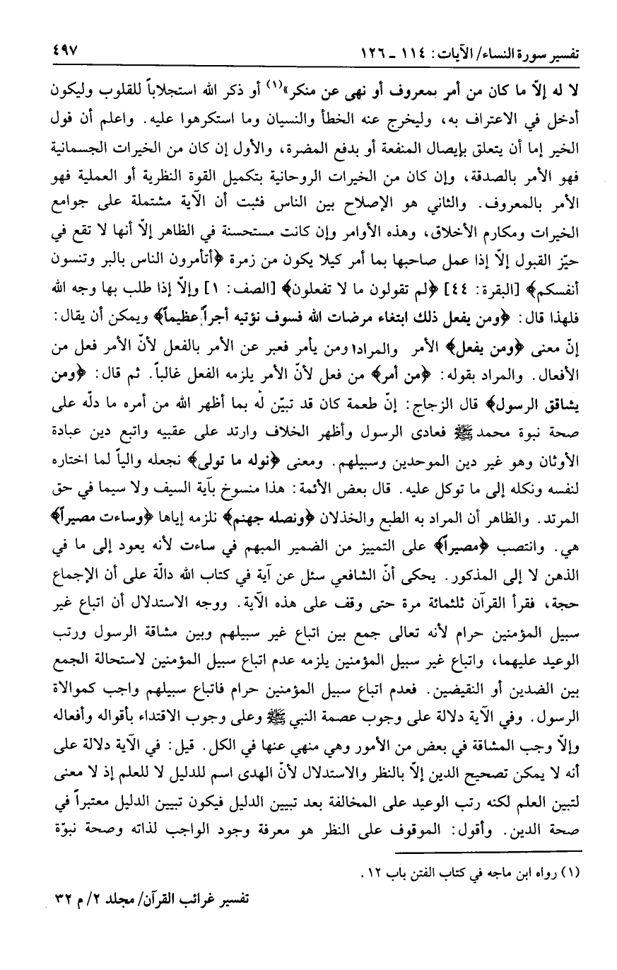 إنّ معنى وَمَنْ يَفْعَلْ الأمر والمراد أو؟؟؟ من يأمر فعبر عن الأمر بالفعل لأنّ الأمر فعل من الأفعال. والمراد بقوله: مَنْ أَمَرَ من فعل لأنّ الأمر يلزمه الفعل غالبا. ثم قال: وَمَنْ يُشاقِقِ الرَّسُولَ قال الزجاج: إنّ طعمة كان قد تبيّن له بما أظهر الله من أمره ما دلّه على صحة نبوة محمد صلى الله عليه وسلم فعادى الرسول وأظهر الخلاف وارتد على عقبيه واتبع دين عبادة الأوثان وهو غير دين الموحدين وسبيلهم. ومعنى نُوَلِّهِ ما تَوَلَّى نجعله واليا لما اختاره لنفسه ونكله إلى ما توكل عليه. قال بعض الأئمة: هذا منسوخ بآية السيف ولا سيما في حق المرتد. والظاهر أن المراد به الطبع والخذلان وَنُصْلِهِ جَهَنَّمَ نلزمه إياها وَساءَتْ مَصِيراً هي. وانتصب مَصِيراً على التمييز من الضمير المبهم في ساءت لأنه يعود إلى ما في الذهن لا إلى المذكور. يحكى أنّ الشافعي سئل عن آية في كتاب الله دالّة على أن الإجماع حجة، فقرأ القرآن ثلاثمائة مرة حتى وقف على هذه الآية. ووجه الاستدلال أن اتباع غير سبيل المؤمنين حرام لأنه تعالى جمع بين اتباع غير سبيلهم وبين مشاقة الرسول ورتب الوعيد عليهما، واتباع غير سبيل المؤمنين يلزمه عدم اتباع سبيل المؤمنين لاستحالة الجمع بين الضدين أو النقيضين. فعدم اتباع سبيل المؤمنين حرام فاتباع سبيلهم واجب كموالاة الرسول. وفي الآية دلالة على وجوب عصمة النبي صلى الله عليه وسلم وعلى وجوب الاقتداء بأقواله وأفعاله وإلّا وجب المشاقة في بعض من الأمور وهي منهي عنها في الكل. قيل: في الآية دلالة على أنه لا يمكن تصحيح الدين إلّا بالنظر والاستدلال لأنّ الهدى اسم للدليل لا للعلم إذ لا معنى لتبين العلم لكنه رتب الوعيد على المخالفة بعد تبيين الدليل فيكون تبيين الدليل معتبرا في صحة الدين. وأقول: الموقوف على النظر هو معرفة وجود الواجب لذاته وصحة نبوّة