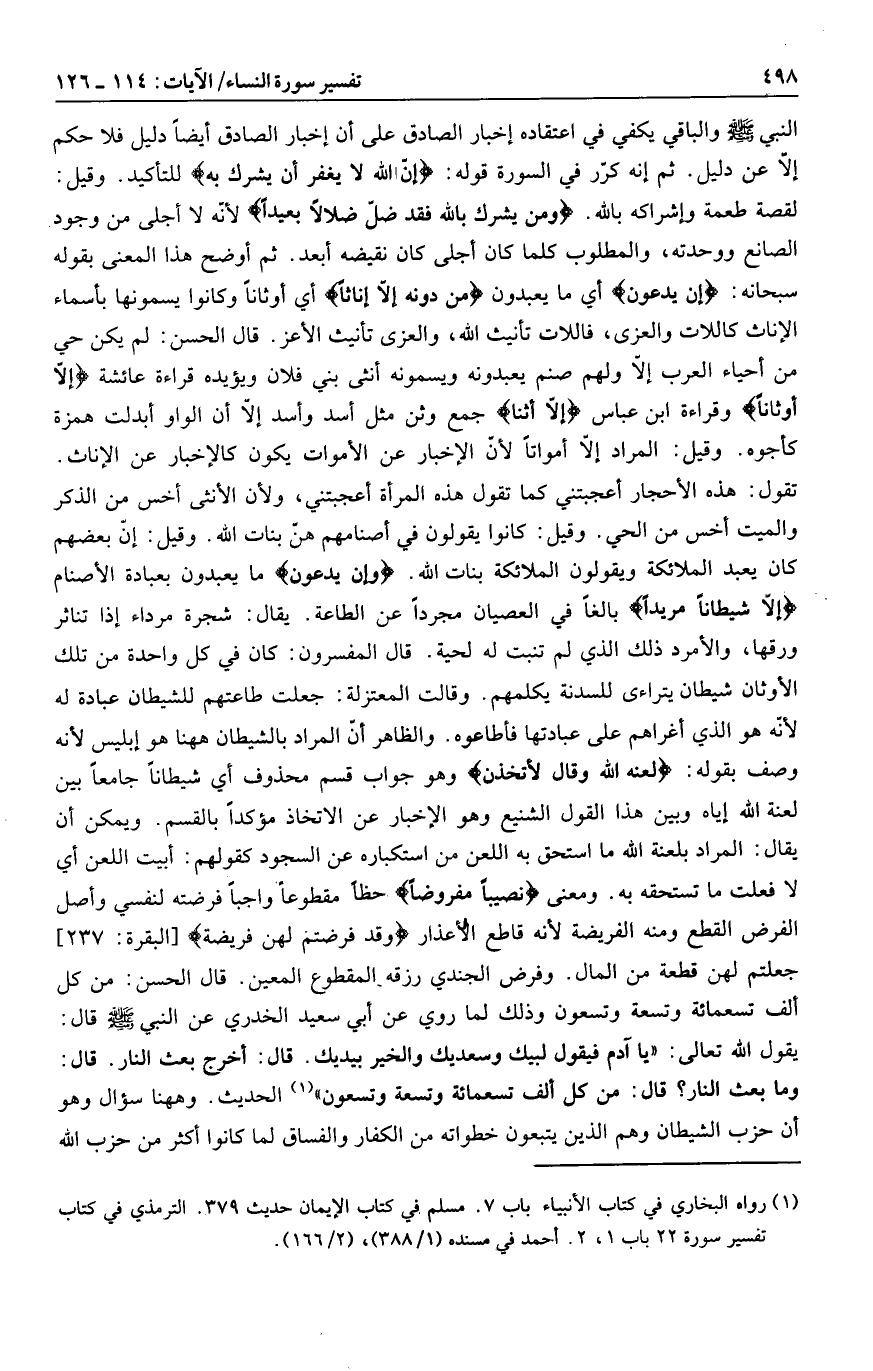 تقول: هذه الأحجار أعجبتني كما تقول هذه المرأة أعجبتني، ولأن الأنثى أخس من الذكر والميت أخس من الحي. وقيل: كانوا يقولون في أصنامهم هنّ بنات الله. وقيل: إنّ بعضهم كان يعبد الملائكة ويقولون الملائكة بنات الله. وَإِنْ يَدْعُونَ ما يعبدون بعبادة الأصنام إِلَّا شَيْطاناً مَرِيداً بالغا في العصيان مجردا عن الطاعة. يقال: شجرة مرداء إذا تناثر ورقها، والأمرد ذلك الذي لم تنبت له لحية. قال المفسرون: كان في كل واحدة من تلك الأوثان شيطان يتراءى للسدنة يكلمهم. وقالت المعتزلة: جعلت طاعتهم للشيطان عبادة له لأنه هو الذي أغراهم على عبادتها فأطاعوه. والظاهر أنّ المراد بالشيطان هاهنا هو إبليس لأنه وصف بقوله: لَعَنَهُ اللَّهُ وَقالَ لَأَتَّخِذَنَّ وهو جواب قسم محذوف أي شيطانا جامعا بين لعنة الله إياه وبين هذا القول الشنيع وهو الإخبار عن الاتخاذ مؤكدا بالقسم. ويمكن أن يقال: المراد بلعنة الله ما استحق به اللعن من استكباره عن السجود كقولهم: أبيت اللعن أي لا فعلت ما تستحقه به. ومعنى نَصِيباً مَفْرُوضاً حظا مقطوعا واجبا فرضته لنفسي وأصل الفرض القطع ومنه الفريضة لأنه قاطع الأعذار وَقَدْ فَرَضْتُمْ لَهُنَّ فَرِيضَةً [البقرة: 237] جعلتم لهن قطعة من المال. وفرض الجندي رزقه المقطوع المعين. قال الحسن: من كل ألف تسعمائة وتسعة وتسعون وذلك لما