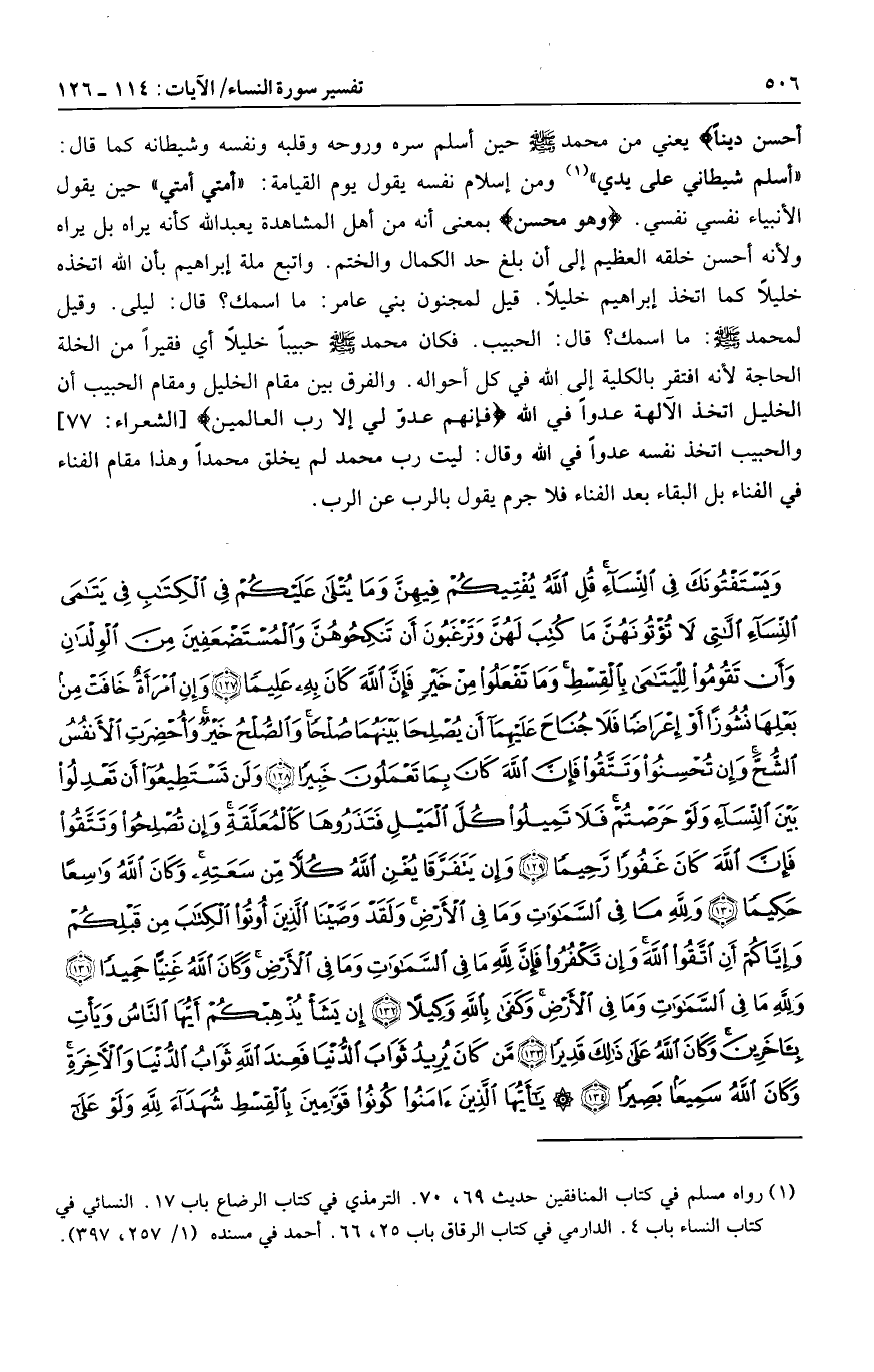 وَيَسْتَفْتُونَكَ فِي النِّساءِ قُلِ اللَّهُ يُفْتِيكُمْ فِيهِنَّ وَما يُتْلى عَلَيْكُمْ فِي الْكِتابِ فِي يَتامَى النِّساءِ اللاَّتِي لا تُؤْتُونَهُنَّ ما كُتِبَ لَهُنَّ وَتَرْغَبُونَ أَنْ تَنْكِحُوهُنَّ وَالْمُسْتَضْعَفِينَ مِنَ الْوِلْدانِ وَأَنْ تَقُومُوا لِلْيَتامى بِالْقِسْطِ وَما تَفْعَلُوا مِنْ خَيْرٍ فَإِنَّ اللَّهَ كانَ بِهِ عَلِيماً (127) وَإِنِ امْرَأَةٌ خافَتْ مِنْ بَعْلِها نُشُوزاً أَوْ إِعْراضاً فَلا جُناحَ عَلَيْهِما أَنْ يُصْلِحا بَيْنَهُما صُلْحاً وَالصُّلْحُ خَيْرٌ وَأُحْضِرَتِ الْأَنْفُسُ الشُّحَّ وَإِنْ تُحْسِنُوا وَتَتَّقُوا فَإِنَّ اللَّهَ كانَ بِما تَعْمَلُونَ خَبِيراً (128) وَلَنْ تَسْتَطِيعُوا أَنْ تَعْدِلُوا بَيْنَ النِّساءِ وَلَوْ حَرَصْتُمْ فَلا تَمِيلُوا كُلَّ الْمَيْلِ فَتَذَرُوها كَالْمُعَلَّقَةِ وَإِنْ تُصْلِحُوا وَتَتَّقُوا فَإِنَّ اللَّهَ كانَ غَفُوراً رَحِيماً (129) وَإِنْ يَتَفَرَّقا يُغْنِ اللَّهُ كُلاًّ مِنْ سَعَتِهِ وَكانَ اللَّهُ واسِعاً حَكِيماً (130) وَلِلَّهِ ما فِي السَّماواتِ وَما فِي الْأَرْضِ وَلَقَدْ وَصَّيْنَا الَّذِينَ أُوتُوا الْكِتابَ مِنْ قَبْلِكُمْ وَإِيَّاكُمْ أَنِ اتَّقُوا اللَّهَ وَإِنْ تَكْفُرُوا فَإِنَّ لِلَّهِ ما فِي السَّماواتِ وَما فِي الْأَرْضِ وَكانَ اللَّهُ غَنِيًّا حَمِيداً (131)