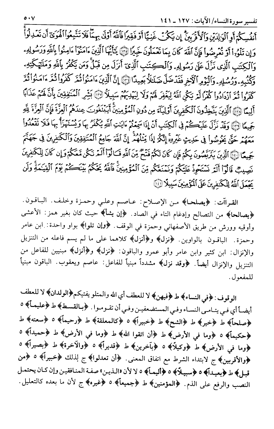 فِي النِّساءِ ط فِيهِنَّ لا للعطف أي الله والمتلو يفتيكم الْوِلْدانِ لا للعطف أيضا أي في يتامى النساء وفي المستضعفين وفي أن تقوموا. بِالْقِسْطِ ط عَلِيماً هـ صُلْحاً ط خَيْرٌ ط الشُّحَّ ط خَبِيراً هـ كَالْمُعَلَّقَةِ ط رَحِيماً هـ سَعَتِهِ ط حَكِيماً هـ وَما فِي الْأَرْضِ ط أَنِ اتَّقُوا اللَّهَ ط وَما فِي الْأَرْضِ ط حَمِيداً هـ وَما فِي الْأَرْضِ ط وَكِيلًا هـ بِآخَرِينَ ط قَدِيراً هـ وَالْآخِرَةِ ط بَصِيراً هـ وَالْأَقْرَبِينَ ج لابتداء الشرط مع اتفاق المعنى. أَنْ تَعْدِلُوا ج لذلك خَبِيراً هـ مِنْ قَبْلُ ط بَعِيداً هـ سَبِيلًا هـ أَلِيماً هـ لا لأن «الذين» صفة المنافقين وإن كان يحتمل النصب والرفع على الذم. الْمُؤْمِنِينَ ط جَمِيعاً هـ غَيْرِهِ ج لأن ما بعده كالتعليل.