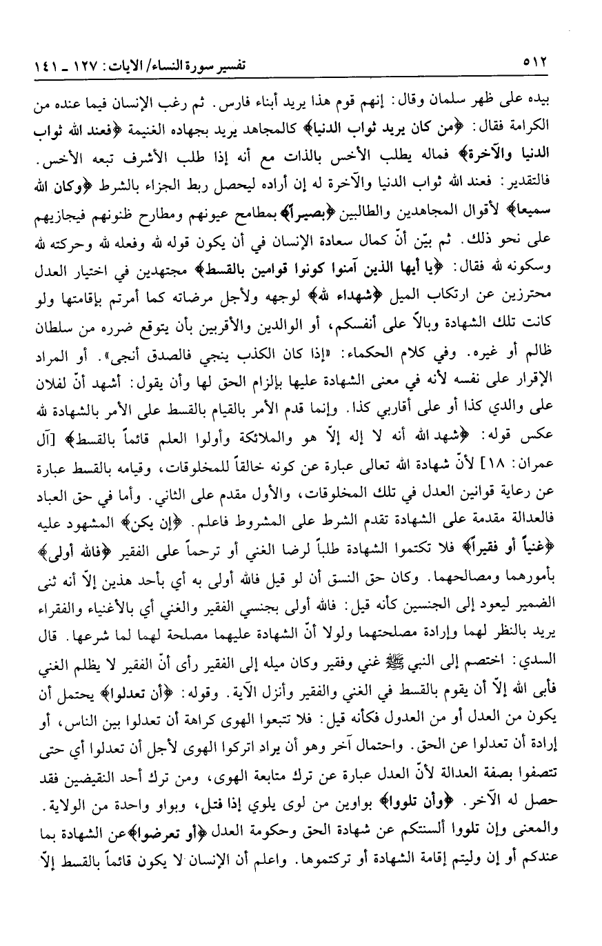 فالتقدير: فعند الله ثواب الدنيا والآخرة له إن أراده ليحصل ربط الجزاء بالشرط وَكانَ اللَّهُ سَمِيعاً لأقوال المجاهدين والطالبين بَصِيراً بمطامح عيونهم ومطارح ظنونهم فيجازيهم على نحو ذلك. ثم بيّن أنّ كمال سعادة الإنسان في أن يكون قوله لله وفعله لله وحركته لله وسكونه لله فقال: يا أَيُّهَا الَّذِينَ آمَنُوا كُونُوا قَوَّامِينَ بِالْقِسْطِ مجتهدين في اختيار العدل محترزين عن ارتكاب الميل شُهَداءَ لِلَّهِ لوجهه ولأجل مرضاته كما أمرتم بإقامتها ولو كانت تلك الشهادة وبالا على أنفسكم، أو الوالدين والأقربين بأن يتوقع ضرره من سلطان ظالم أو غيره. وفي كلام الحكماء: «إذا كان الكذب ينجي فالصدق أنجى» . أو المراد الإقرار على نفسه لأنه في معنى الشهادة عليها بإلزام الحق لها وأن يقول: أشهد أنّ لفلان على والدي كذا أو على أقاربي كذا. وإنما قدم الأمر بالقيام بالقسط على الأمر بالشهادة لله عكس قوله: شَهِدَ اللَّهُ أَنَّهُ لا إِلهَ إِلَّا هُوَ وَالْمَلائِكَةُ وَأُولُوا الْعِلْمِ قائِماً بِالْقِسْطِ [آل عمران: 18] لأنّ شهادة الله تعالى عبارة عن كونه خالقا للمخلوقات، وقيامه بالقسط عبارة عن رعاية قوانين العدل في تلك المخلوقات، والأول مقدم على الثاني. وأما في حق العباد فالعدالة مقدمة على الشهادة تقدم الشرط على المشروط فاعلم. إِنْ يَكُنْ المشهود عليه غَنِيًّا أَوْ فَقِيراً فلا تكتموا الشهادة طلبا لرضا الغني أو ترحما على الفقير فَاللَّهُ أَوْلى بأمورهما ومصالحهما. وكان حق النسق أن لو قيل فالله أولى به أي بأحد هذين إلّا أنه ثنى الضمير ليعود إلى الجنسين كأنه قيل: فالله أولى بجنسي الفقير والغني أي بالأغنياء والفقراء يريد بالنظر لهما وإرادة مصلحتهما ولولا أنّ الشهادة عليهما مصلحة لهما لما شرعها.
