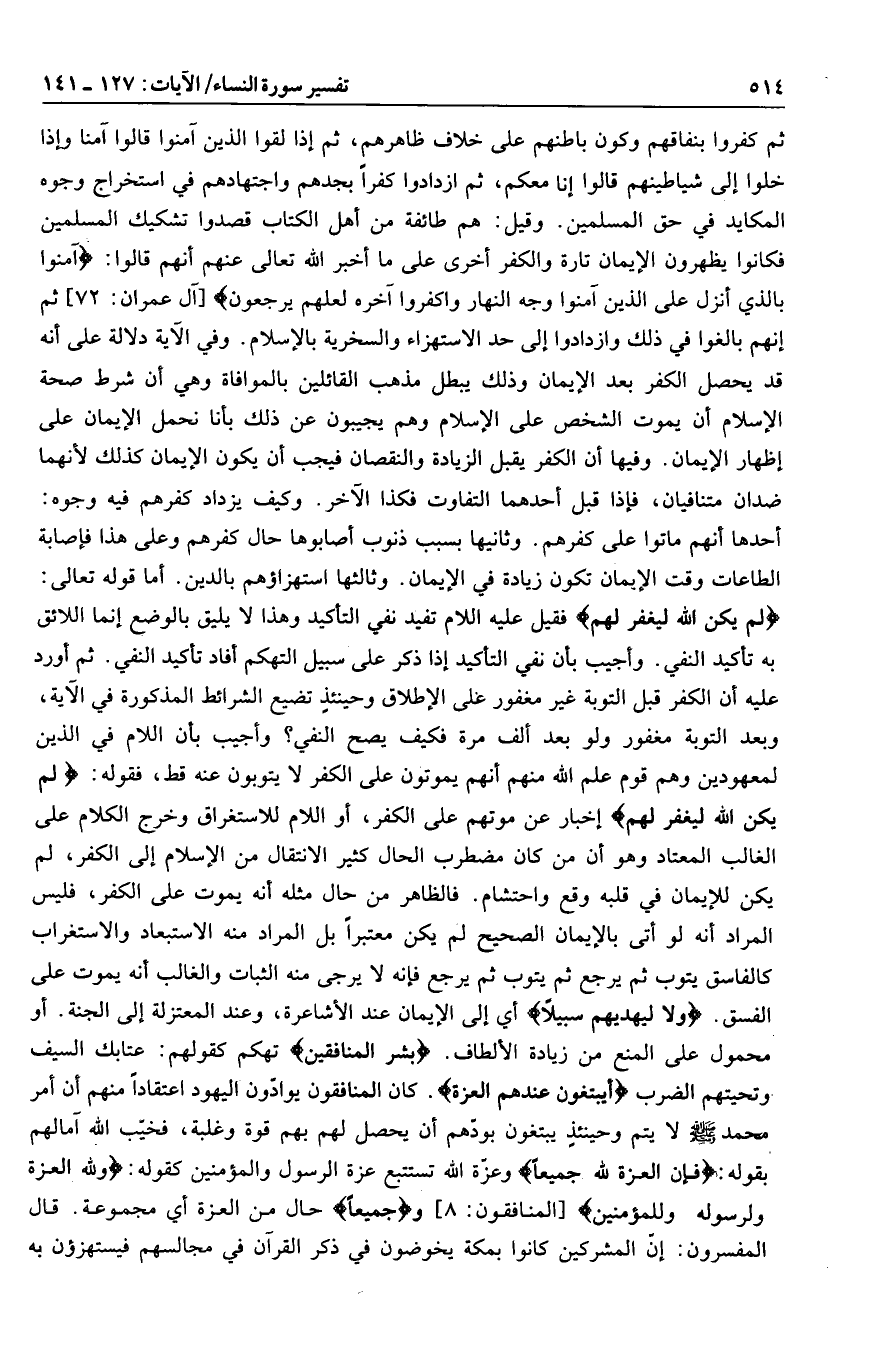لَمْ يَكُنِ اللَّهُ لِيَغْفِرَ لَهُمْ فقيل عليه اللام تفيد نفي التأكيد وهذا لا يليق بالوضع إنما اللائق به تأكيد النفي. وأجيب بأن نفي التأكيد إذا ذكر على سبيل التهكم أفاد تأكيد النفي. ثم أورد عليه أن الكفر قبل التوبة غير مغفور على الإطلاق وحينئذ تضيع الشرائط المذكورة في الآية، وبعد التوبة مغفور ولو بعد ألف مرة فكيف يصح النفي؟ وأجيب بأن اللام في الذين لمعهودين وهم قوم علم الله منهم أنهم يموتون على الكفر لا يتوبون عنه قط، فقوله: لَمْ يَكُنِ اللَّهُ لِيَغْفِرَ لَهُمْ إخبار عن موتهم على الكفر، أو اللام للاستغراق وخرج الكلام على الغالب المعتاد وهو أن من كان مضطرب الحال كثير الانتقال من الإسلام إلى الكفر، لم يكن للإيمان في قلبه وقع واحتشام. فالظاهر من حال مثله أنه يموت على الكفر، فليس المراد أنه لو أتى بالإيمان الصحيح لم يكن معتبرا بل المراد منه الاستبعاد والاستغراب كالفاسق يتوب ثم يرجع ثم يتوب ثم يرجع فإنه لا يرجى منه الثبات والغالب أنه يموت على الفسق. وَلا لِيَهْدِيَهُمْ سَبِيلًا أي إلى الإيمان عند الأشاعرة، وعند المعتزلة إلى الجنة. أو محمول على المنع من زيادة الألطاف. بَشِّرِ الْمُنافِقِينَ تهكم كقولهم: عتابك الصيف تحيتهم الضرب أَيَبْتَغُونَ عِنْدَهُمُ الْعِزَّةَ. كان المنافقون يوادّون اليهود اعتقادا منهم أن أمر محمد صلى الله عليه وسلم لا يتم وحينئذ يبتغون بودّهم أن يحصل لهم بهم قوة وغلبة، فخيّب الله آمالهم بقوله: فَإِنَّ الْعِزَّةَ لِلَّهِ جَمِيعاً وعزّة الله تستتبع عزة الرسول والمؤمنين كقوله: وَلِلَّهِ الْعِزَّةُ وَلِرَسُولِهِ وَلِلْمُؤْمِنِينَ