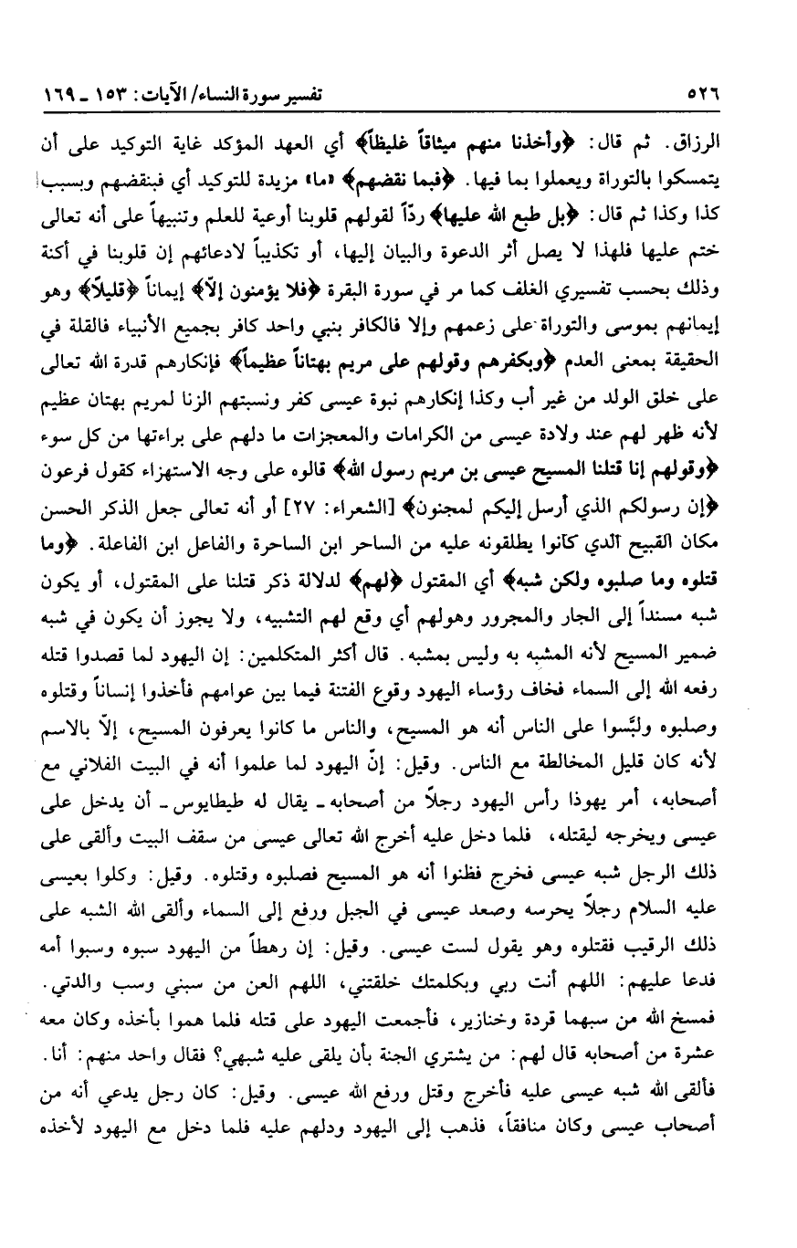 الرزاق. ثم قال: وَأَخَذْنا مِنْهُمْ مِيثاقاً غَلِيظاً أي العهد المؤكد غاية التوكيد على أن يتمسكوا بالتوراة ويعملوا بما فيها. فَبِما نَقْضِهِمْ «ما» مزيدة للتوكيد أي فبنقضهم وبسبب كذا وكذا ثم قال: بَلْ طَبَعَ اللَّهُ عَلَيْها ردّا لقولهم قلوبنا أوعية للعلم وتنبيها على أنه تعالى ختم عليها فلهذا لا يصل أثر الدعوة والبيان إليها، أو تكذيبا لادعائهم إن قلوبنا في أكنة وذلك بحسب تفسيري الغلف كما مر في سورة البقرة فَلا يُؤْمِنُونَ إِلَّا إيمانا قَلِيلًا وهو إيمانهم بموسى والتوراة على زعمهم وإلا فالكافر بنبي واحد كافر بجميع الأنبياء فالقلة في الحقيقة بمعنى العدم وَبِكُفْرِهِمْ وَقَوْلِهِمْ عَلى مَرْيَمَ بُهْتاناً عَظِيماً فإنكارهم قدرة الله تعالى على خلق الولد من غير أب وكذا إنكارهم نبوة عيسى كفر ونسبتهم الزنا لمريم بهتان عظيم لأنه ظهر لهم عند ولادة عيسى من الكرامات والمعجزات ما دلهم على براءتها من كل سوء وَقَوْلِهِمْ إِنَّا قَتَلْنَا الْمَسِيحَ عِيسَى ابْنَ مَرْيَمَ رَسُولَ اللَّهِ قالوه على وجه الاستهزاء كقول فرعون إِنَّ رَسُولَكُمُ الَّذِي أُرْسِلَ إِلَيْكُمْ لَمَجْنُونٌ [الشعراء: 27] أو أنه تعالى جعل الذكر الحسن مكان القبيح الذي كانوا يطلقونه عليه من الساحر ابن الساحرة والفاعل ابن الفاعلة. وَما قَتَلُوهُ وَما صَلَبُوهُ وَلكِنْ شُبِّهَ أي المقتول لَهُمْ لدلالة ذكر قتلنا على المقتول، أو يكون شبه مسندا إلى الجار والمجرور وهولهم أي وقع لهم التشبيه، ولا يجوز أن يكون في شبه ضمير المسيح لأنه المشبه به وليس بمشبه. قال أكثر المتكلمين: إن اليهود لما قصدوا قتله رفعه الله إلى السماء فخاف رؤساء اليهود وقوع الفتنة فيما بين عوامهم فأخذوا إنسانا وقتلوه وصلبوه ولبّسوا على الناس أنه هو المسيح، والناس ما كانوا يعرفون المسيح، إلّا بالاسم لأنه كان قليل المخالطة مع الناس. وقيل: إنّ اليهود لما علموا أنه في البيت الفلاني مع أصحابه، أمر يهوذا رأس اليهود رجلا من أصحابه- يقال له طيطايوس- أن يدخل على عيسى ويخرجه ليقتله، فلما دخل عليه أخرج الله تعالى عيسى من سقف البيت وألقى على ذلك الرجل شبه عيسى فخرج فظنوا أنه هو المسيح فصلبوه وقتلوه. وقيل: وكلوا بعيسى عليه السلام رجلا يحرسه وصعد عيسى في الجبل ورفع إلى السماء وألقى الله الشبه على ذلك الرقيب فقتلوه وهو يقول لست عيسى. وقيل: إن رهطا من اليهود سبوه وسبوا أمه فدعا عليهم: اللهم أنت ربي وبكلمتك خلقتني، اللهم العن من سبني وسب والدتي.