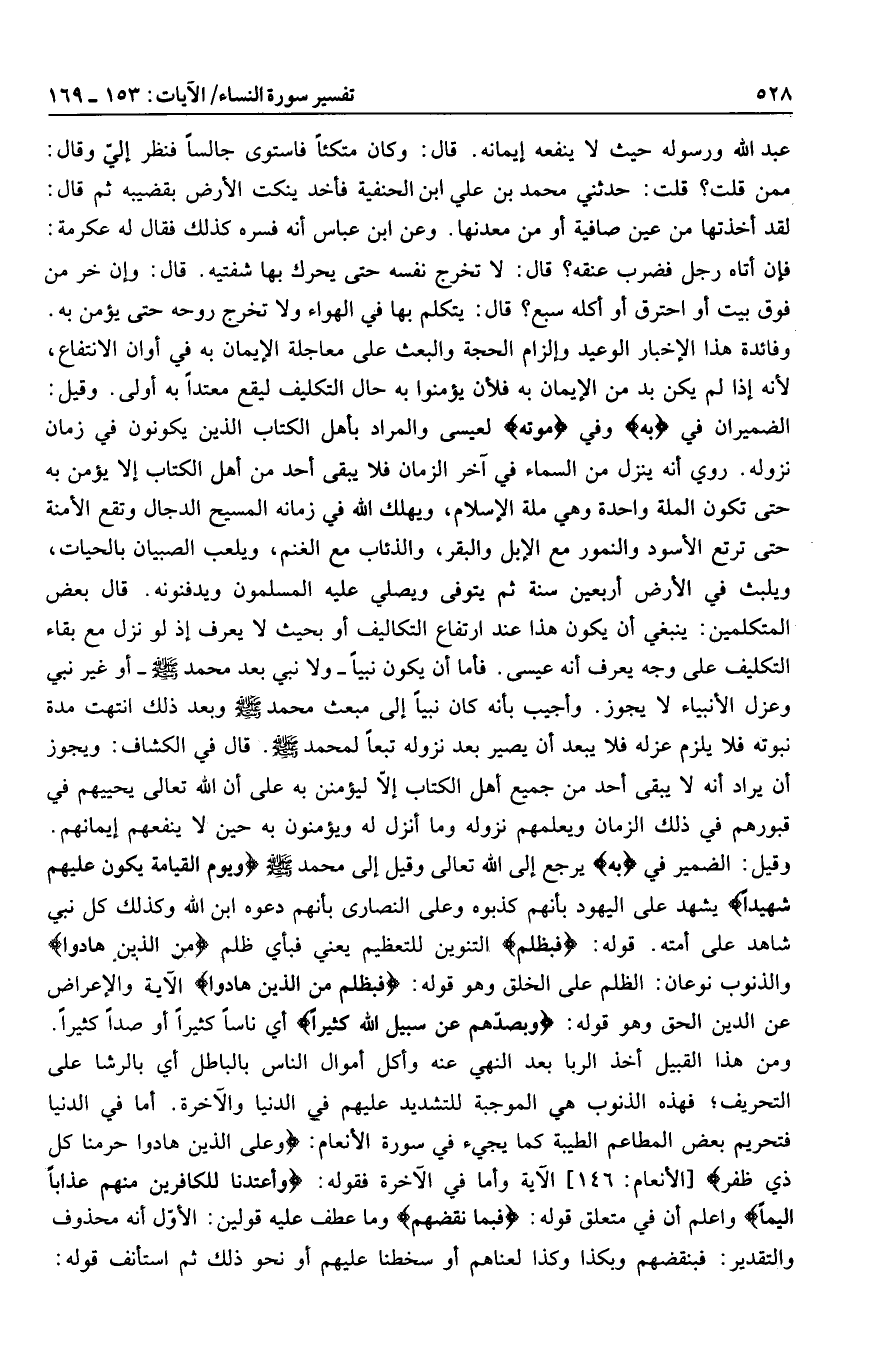 وقيل: الضمير في بِهِ يرجع إلى الله تعالى وقيل إلى محمد صلى الله عليه وسلم وَيَوْمَ الْقِيامَةِ يَكُونُ عَلَيْهِمْ شَهِيداً يشهد على اليهود بأنهم كذبوه وعلى النصارى بأنهم دعوه ابن الله وكذلك كل نبي شاهد على أمته. قوله: فَبِظُلْمٍ التنوين للتعظيم يعني فبأي ظلم مِنَ الَّذِينَ هادُوا والذنوب نوعان: الظلم على الخلق وهو قوله: فَبِظُلْمٍ مِنَ الَّذِينَ هادُوا الآية والإعراض عن الدين الحق وهو قوله: وَبِصَدِّهِمْ عَنْ سَبِيلِ اللَّهِ كَثِيراً أي ناسا كثيرا أو صدا كثيرا.