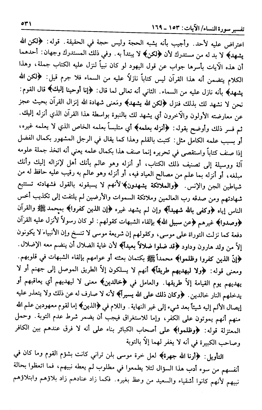 اعتراض عليه لأحد. وأجيب بأنه يشبه الحجة وليس حجة في الحقيقة. قوله: لكِنِ اللَّهُ يَشْهَدُ لا بد له من مستدرك لأن لكِنِ لا يبتدأ به. وفي ذلك المستدرك وجهان: أحدهما أن هذه الآيات بأسرها جواب عن قول اليهود لو كان نبيا لنزل عليه الكتاب جملة، وهذا الكلام يتضمن أنه هذا القرآن ليس كتابا نازلا عليه من السماء فلا جرم قيل: لكِنِ اللَّهُ يَشْهَدُ بأنه نازل عليه من السماء. الثاني أنه تعالى لما قال: إِنَّا أَوْحَيْنا إِلَيْكَ قال القوم: